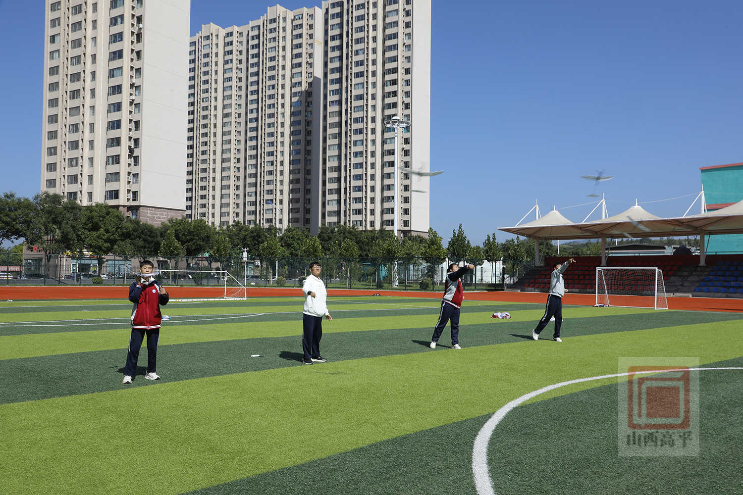 随后,橡皮筋动力飞机比赛开赛,同学们手持自己拼装的飞机模型,眼神专注地调整着机翼角度和橡皮筋的松紧度。随着“放飞”指令发出,一架架飞机借助橡皮筋的弹力冲向天空,有的在空中平稳盘旋,有的沿着优美的弧线滑翔。