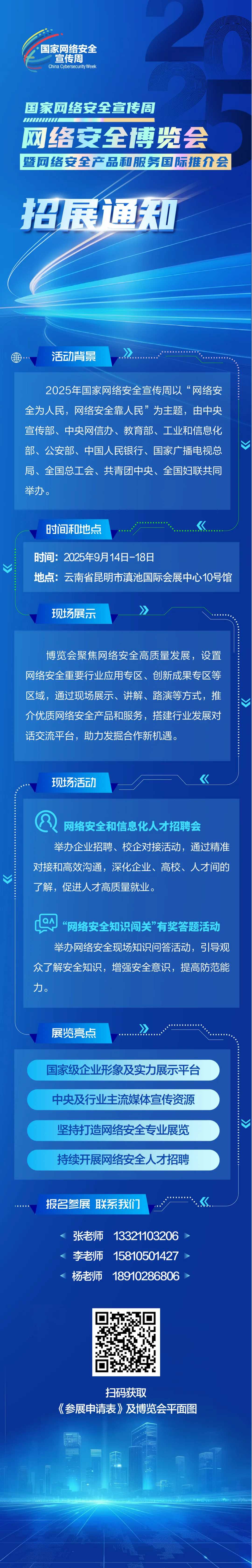 博览会招展正式启动 | 2025年国家网络安全宣传周网络安全博览会暨网络安全产品和服务国际推介会招展通知 来源:网信中国 发布时间:2025-09-12 【字体:小 大】 如果内容不能正常显示,请更换浏览器进行重试 本页二维码 【打印正文】