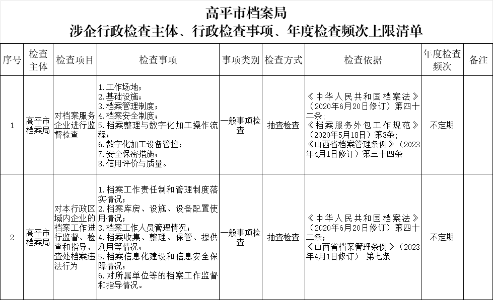 高平市档案局涉企行政检查主体、行政检查事项、年度检查频次上限清单 来源:高平市档案局 发布时间:2025-06-30 【字体:小 大】 如果内容不能正常显示,请更换浏览器进行重试 本页二维码 【打印正文】