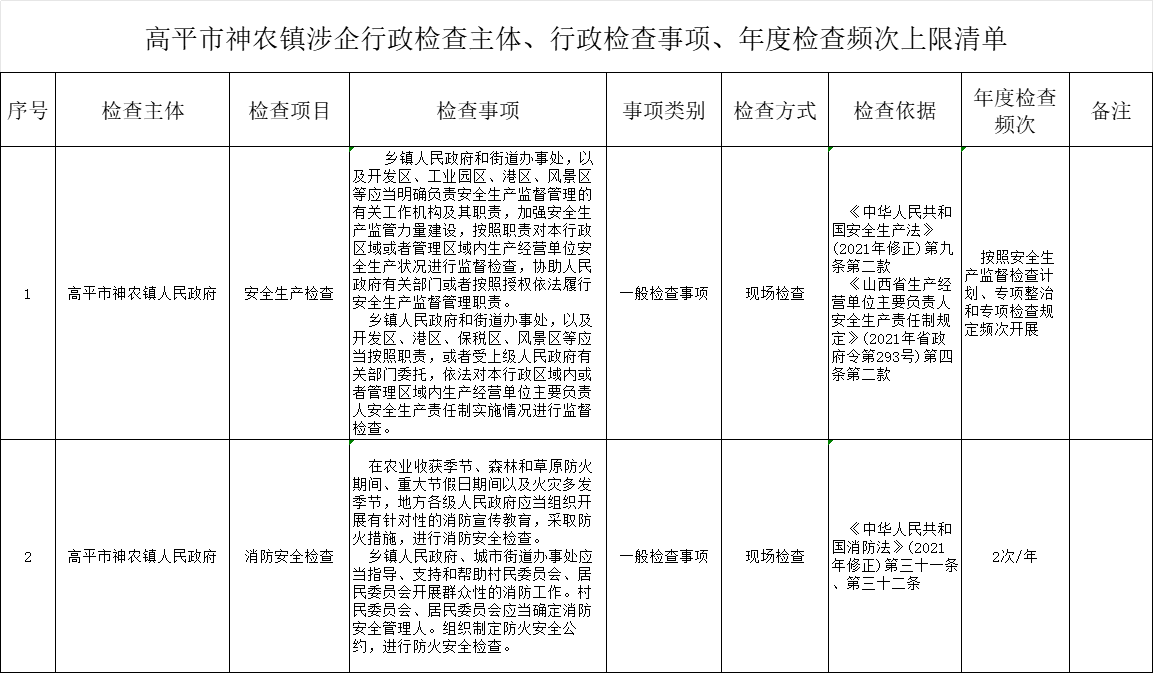 神农镇涉企行政检查主体、行政检查事项、年度检查频次上限清单