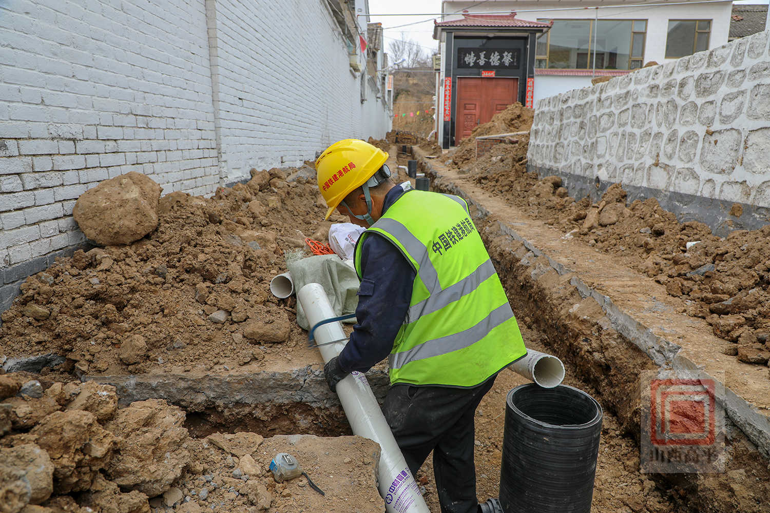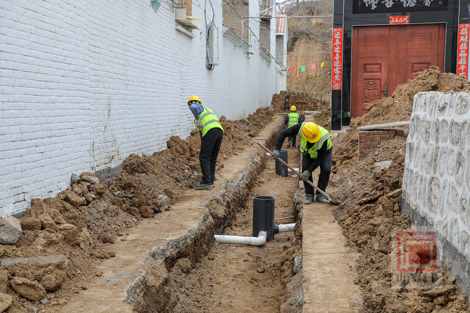 来到野川镇柳树底村项目施工现场,机械轰鸣作响,施工人员分布在各个作业点位,有条不紊地开展沟槽开挖、管道铺设、材料搬运等作业,现场一派如火如荼的繁忙景象。