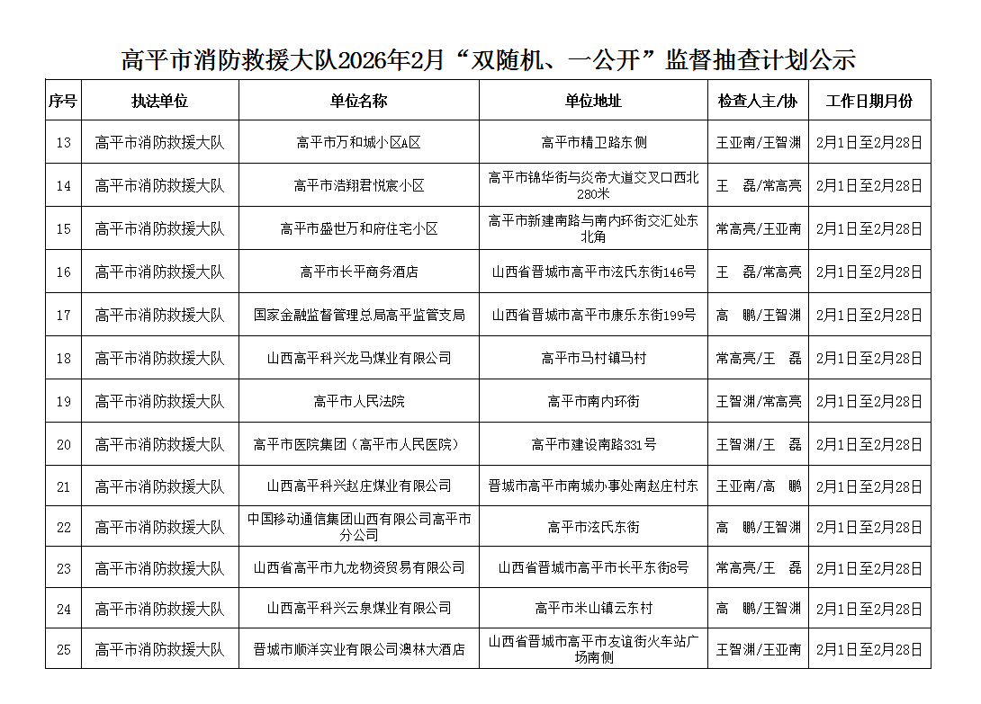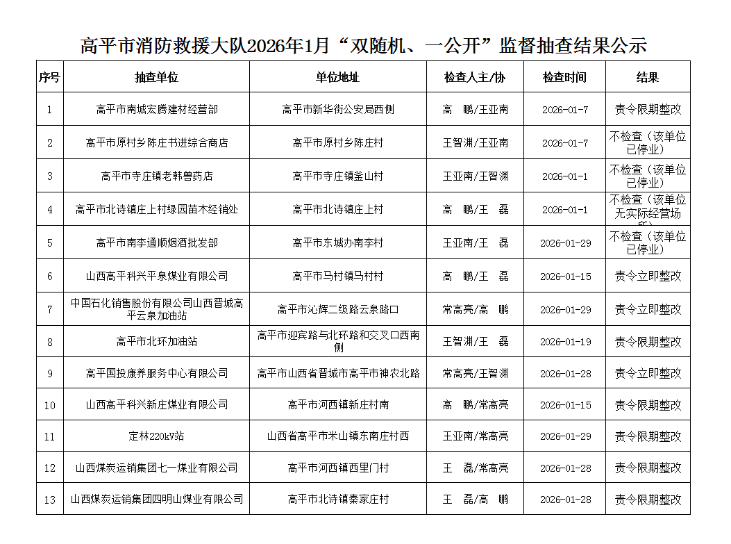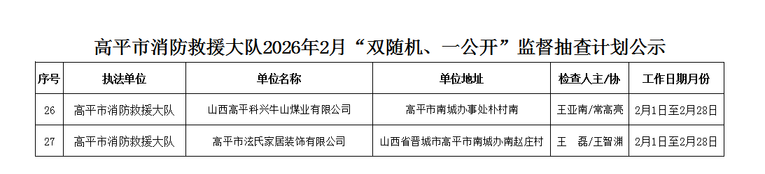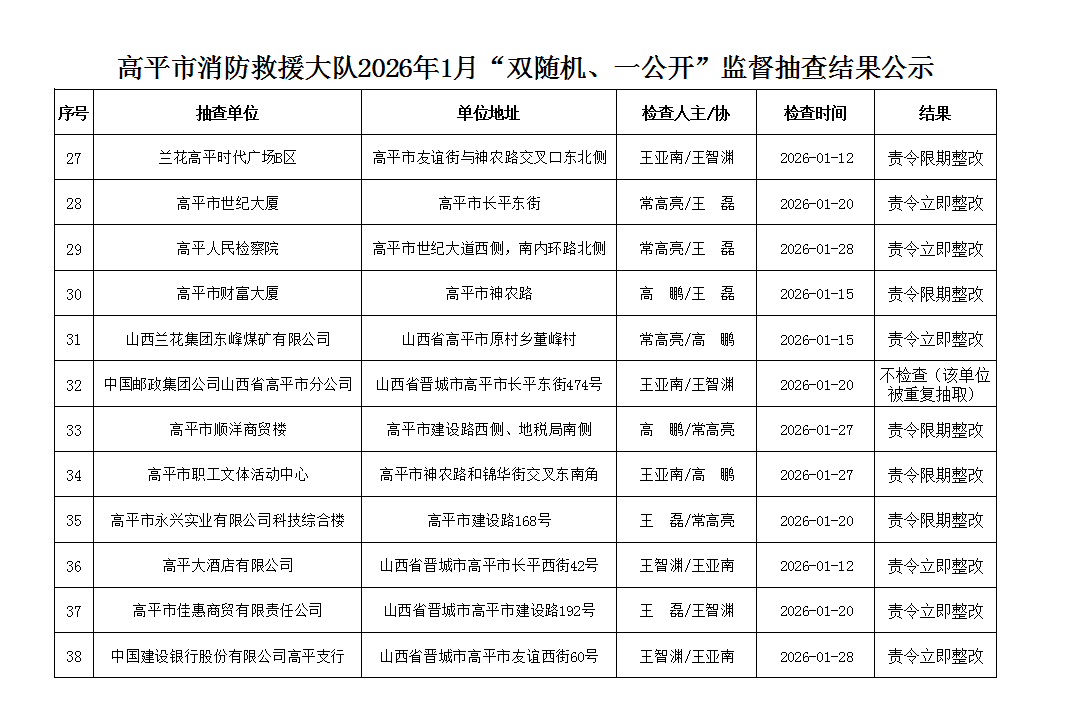 高平市消防救援大队“双随机、一公开”1月结果2月计划公示