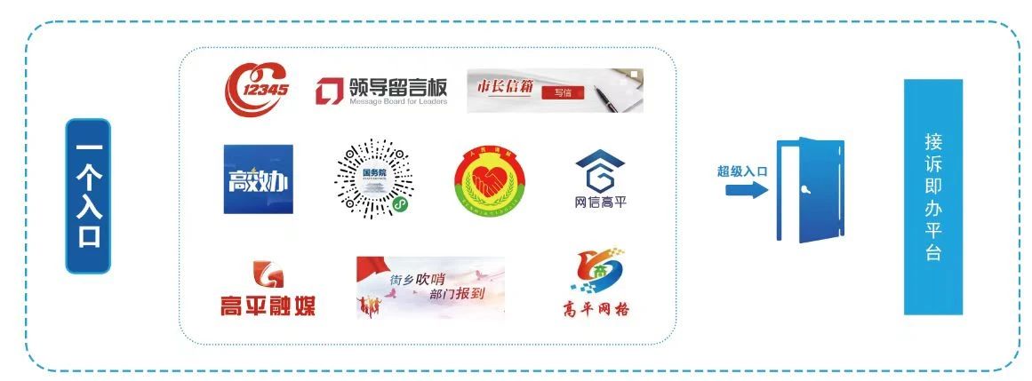 整合国务院客户端微信小程序、人民网地方领导留言板、晋城12345转办事件、市长信箱、高效办、今日高平、矛盾纠纷多元调解、网信办、街乡吹哨、网格重要事件十个诉求渠道,形成一个超级入口,统一由接诉即办平台调度相关部门处置,实现了全天候、全方位、全领域接收群众诉求。