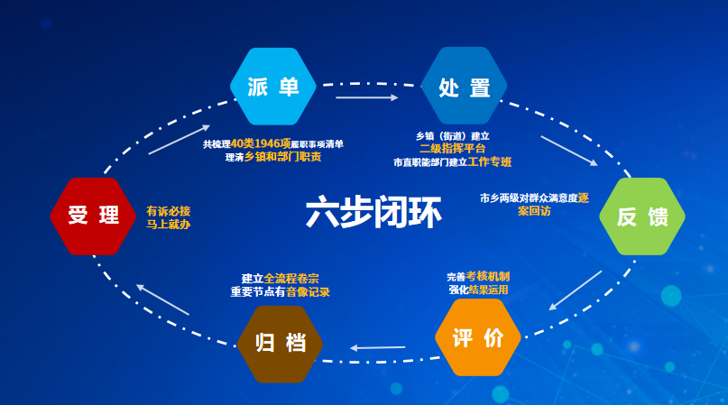 即诉求受理、派单、处置、反馈、评价、归档的六个流程。通过实行365天、7*24小时接收群众诉求,并按照有诉必接,马上就办的原则,在接收群众诉求后,根据梳理出的40类1946项派单目录,将诉求派发至相关部门和乡镇(街道),承办部门在限定时限内办理,事情解决后,市乡两级对群众满意度逐案回访,由接诉即办平台定期对各承办部门诉求办理情况进行考核评价,并对每件诉求建立全流程卷宗,统一进行归档。