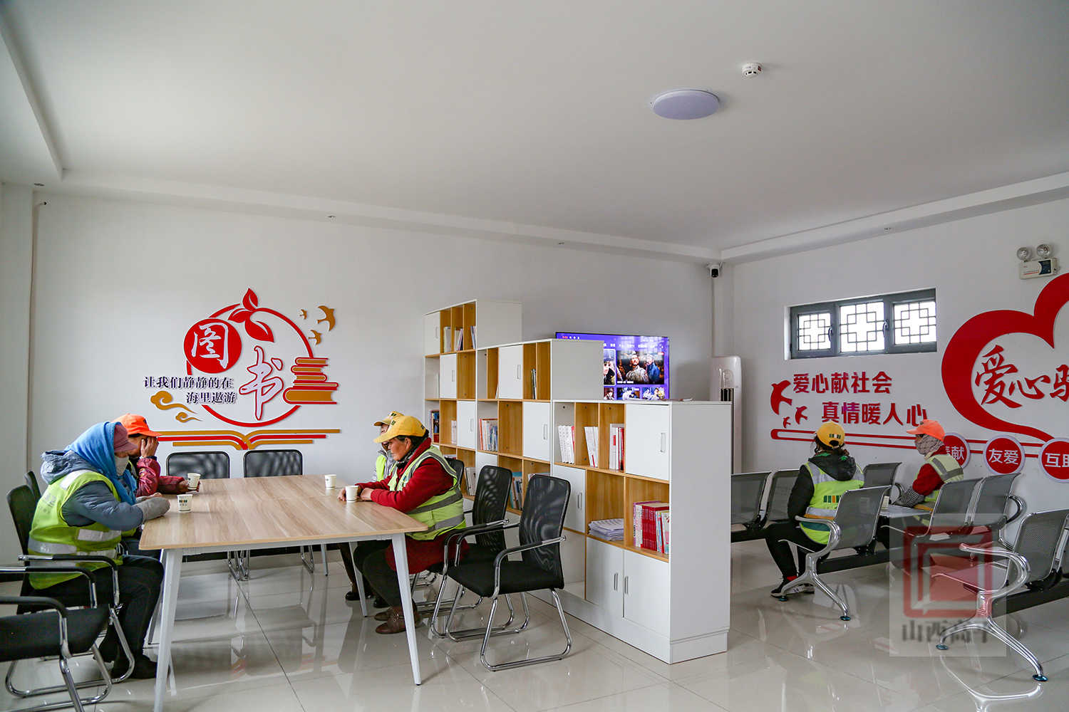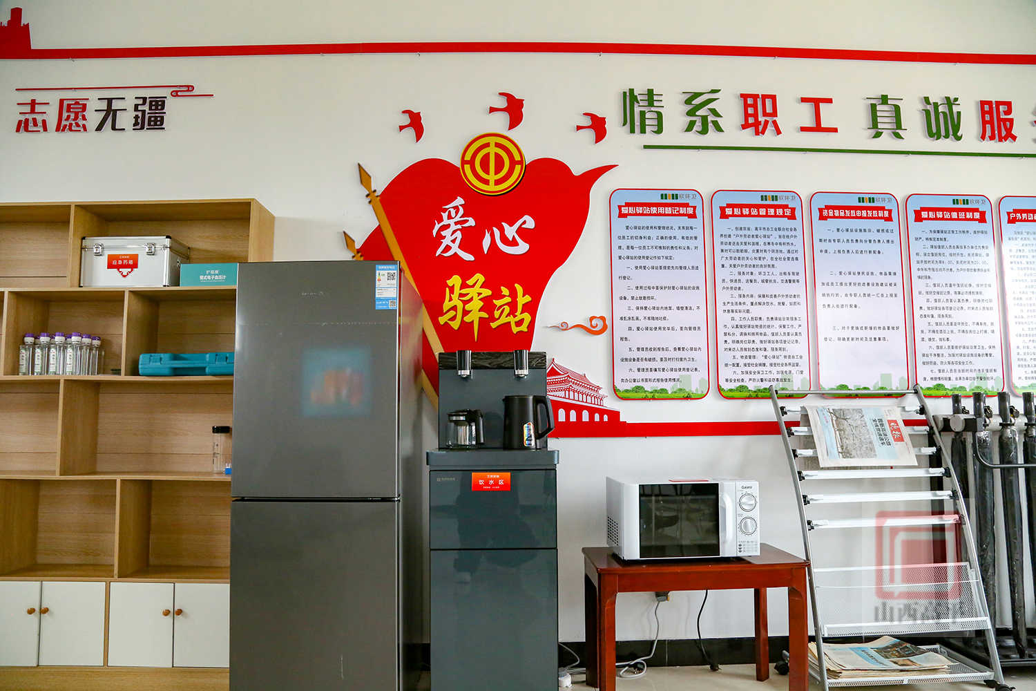 在太行一号旅游公路由市总工会联合市城市管理局共同建设的工会驿站兼环卫驿站,空间宽敞、环境温馨,图书区、休息区、功能区划分明确,让更多户外劳动者感受到了如家一般的温暖。