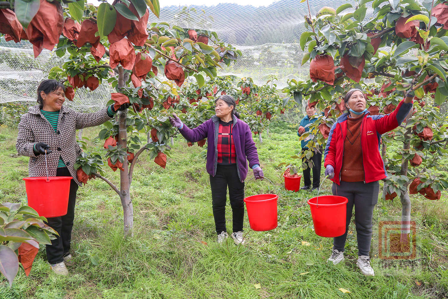 走进采摘园,果香阵阵,个头匀实、色泽泛红的晚秋黄梨缀满枝头。村民们手提小桶穿梭于梨树间,动作娴熟地采摘、装筐,脸上洋溢着丰收的喜悦。