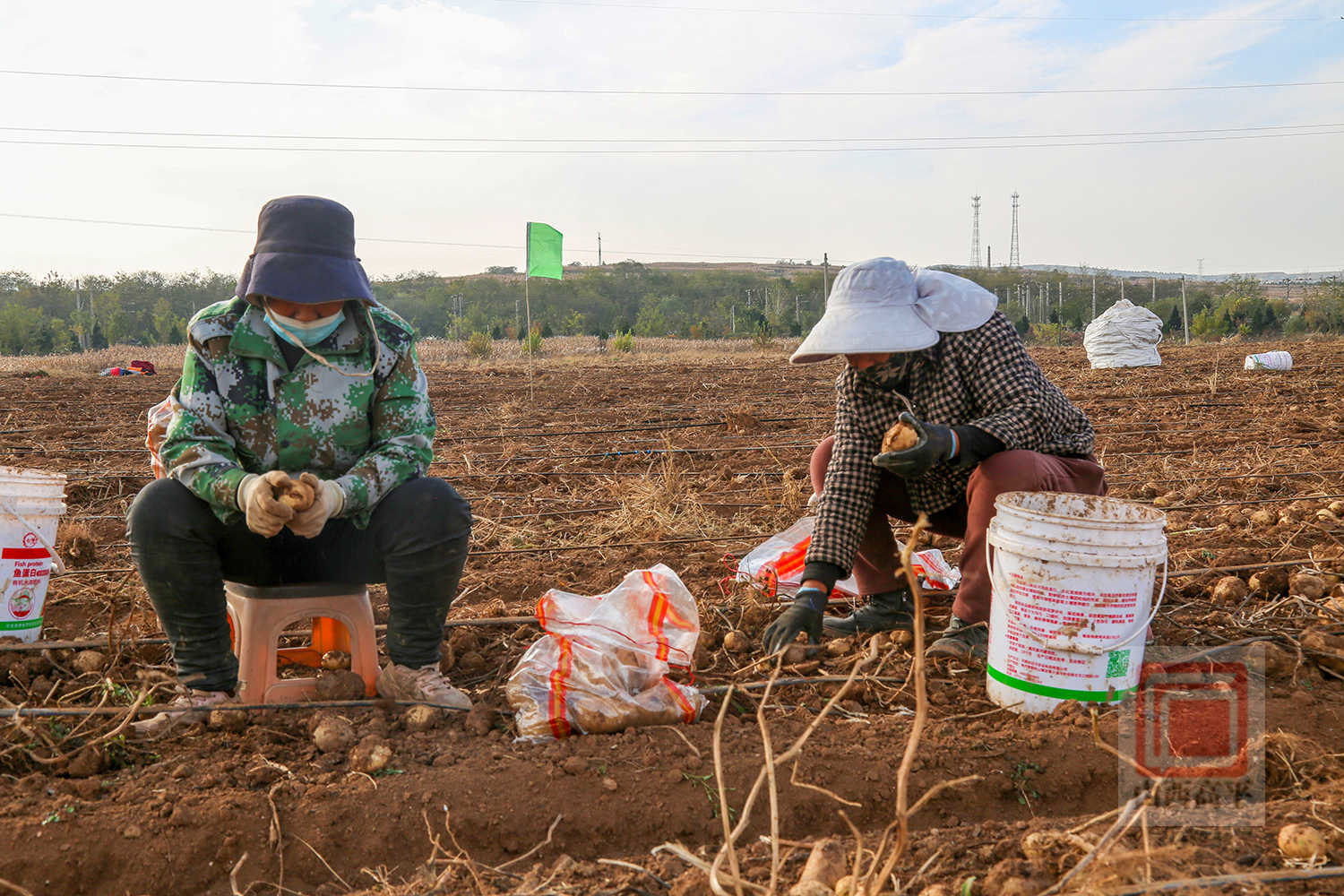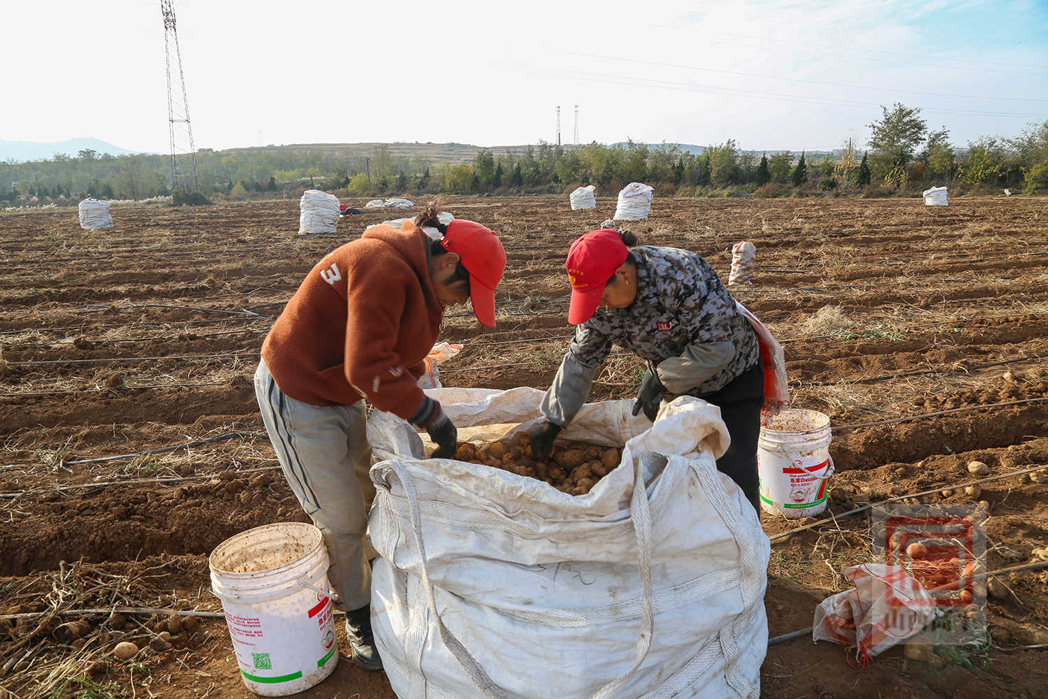 走进土豆种植基地,一派秋忙景象映入眼帘。只见两台土豆收获机在田间来回穿梭,伴着轰鸣声驶过,一颗颗饱满圆润、个头匀称的土豆破土而出,铺满田垄。50余名村民分工协作,动作麻利地捡拾、去泥、分拣、装袋,忙得不亦乐乎。