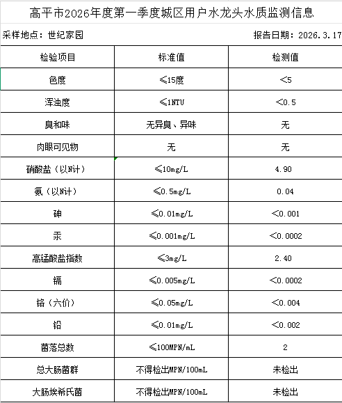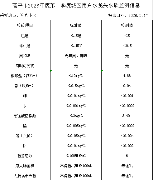 高平市2026年度第一季度城区用户水龙头水质监测信息