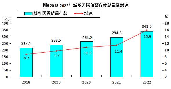 年末全市金融部门本外币各项存款余额454.2亿元,较年初增加61.8亿元,增长15.7%,其中住户存款年末余额341.0亿元,较年初增加46.7亿元,增长15.9%。各项贷款余额222.5亿元,较年初增长37.0亿元,增长20.0%。