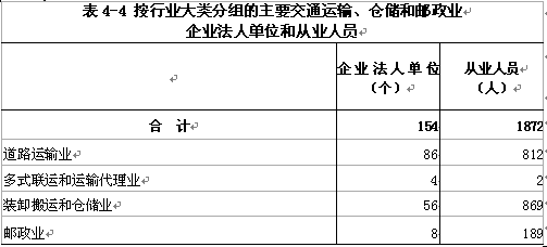 2018年末,全市共有交通运输、仓储和邮政业企业法人单位154个,从业人员1872人,分别比2013年末增长120.00%和29.10%(详见表4-4)。