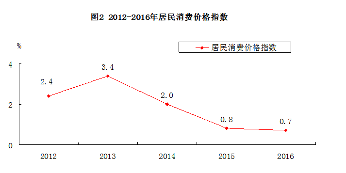 全年居民消费价格比上年上涨0.7%,食品价格上涨1.9%。商品零售价格与上年持平,工业生产者出厂价格下降6.4%,工业生产者购进价格下降0.6%。