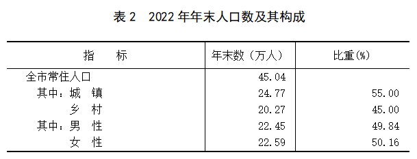 据2022年人口抽样调查,年末全市常住人口为450411人,比上年末减少356人。全年全市出生人口2917人,人口出生率为6.47‰;死亡人口4474人,死亡率为9.93‰;自然增长率为-3.46‰。性别比为99.34(以女性人口为100)。