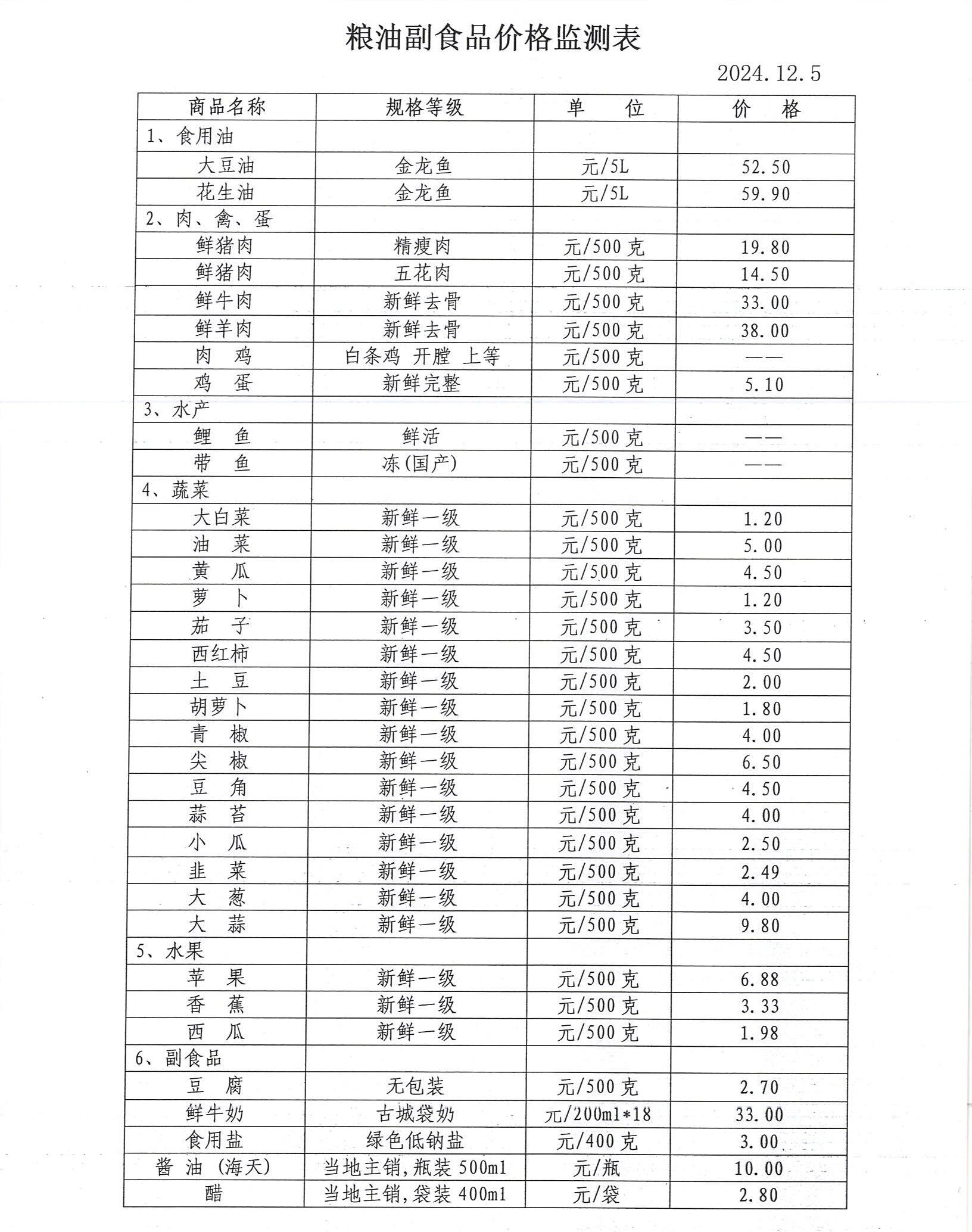 价格旬监测(2024.12.5) 来源: 发布时间:2024-12-05 【字体:小 大】 如果内容不能正常显示,请更换浏览器进行重试 附件:粮油副食品价格监测表.doc 附件:日用工业消费品零售价格监测表.doc 附件:生产资料价格监测表.doc 附件:原粮收购销售价格监测表.doc 附件:成品粮价格监测表.doc 本页二维码 【打印正文】