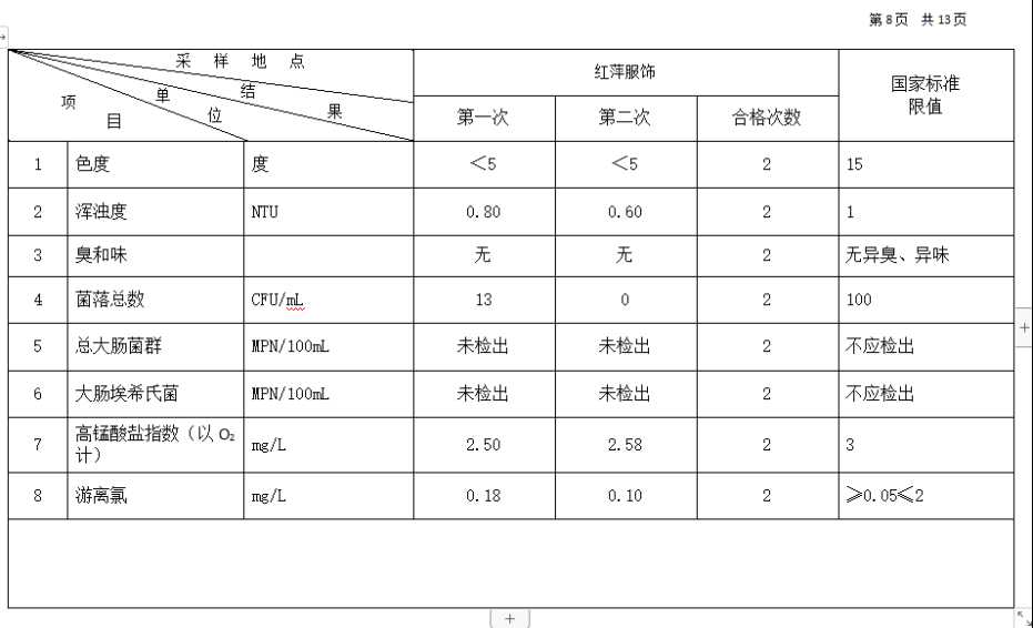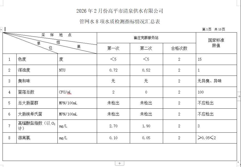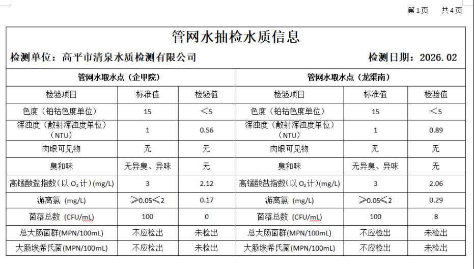 高平市清泉供水有限公司2026年2月份城市集中供水水质信息 来源: 发布时间:2026-03-10 【字体:小 大】 如果内容不能正常显示,请更换浏览器进行重试 附件:2026年2月份高平市清泉供水有限公司水质、管网水质信息.doc 附件:2026年2月份高平市清泉供水有限公司管网水8项水质检测指标情况汇总表.docx 本页二维码 【打印正文】