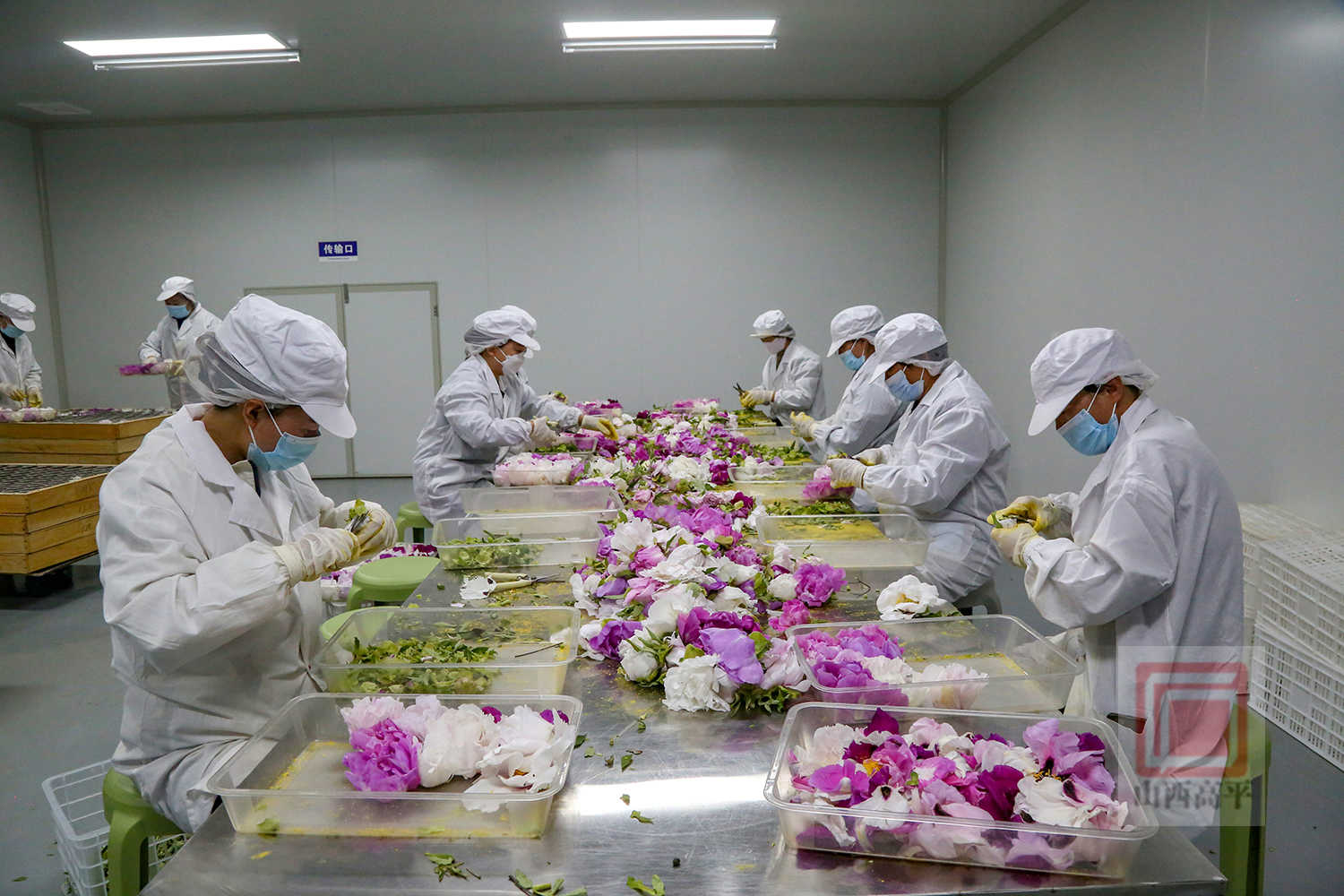在牡丹花茶制作车间,花香浓郁、沁人心脾。村民们分工协作,忙着对刚采摘的牡丹花进行修剪、装盘,随后送至烘烤炉中,进行古法高温炕花。经过一道道工序后,一盒盒精美的牡丹花茶便制作完成,随后销往全国各地。
