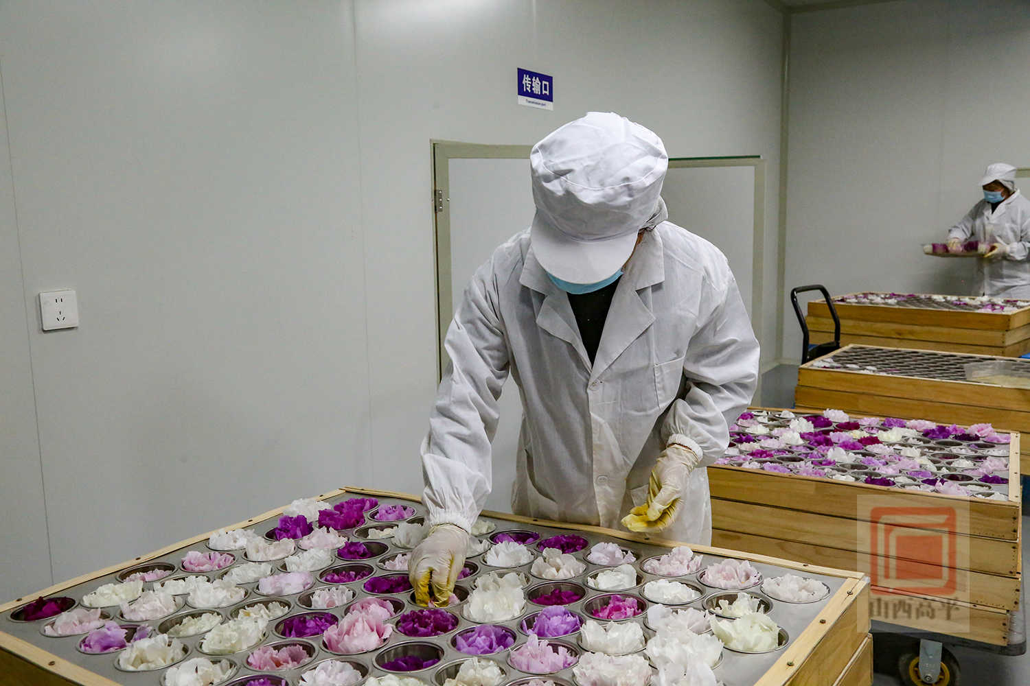 基地负责人李若琳说道:“采摘后的牡丹花需在24小时内完成残叶修剪、装盘,以此保持植物的天然养分。炕花过程中,我们使用非遗柴烧工艺,历经三十多个小时烘焙,将花朵一点点炕干,从而做成一朵完整的牡丹花茶。经过火气烘焙的花朵,湿寒之气消散,变为温润的茶饮,让人入口满是芬芳,滋味格外清甜。”