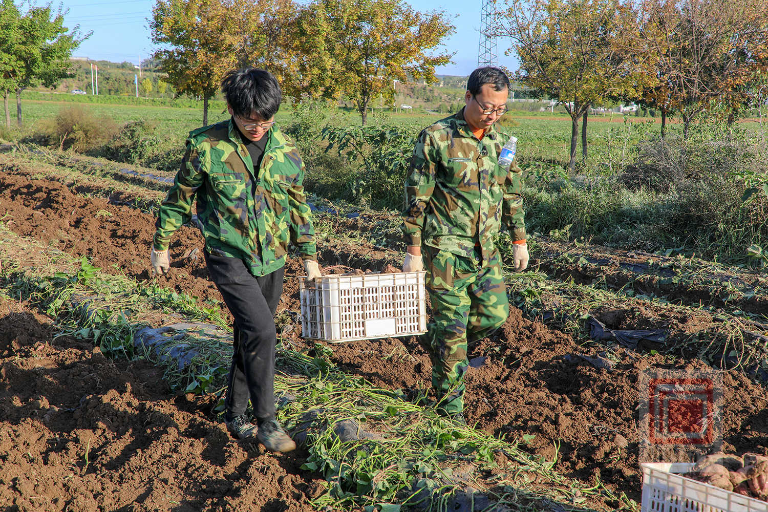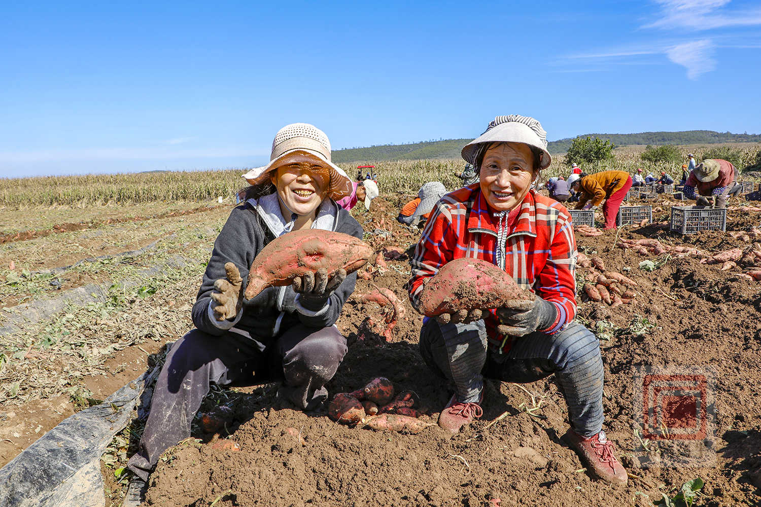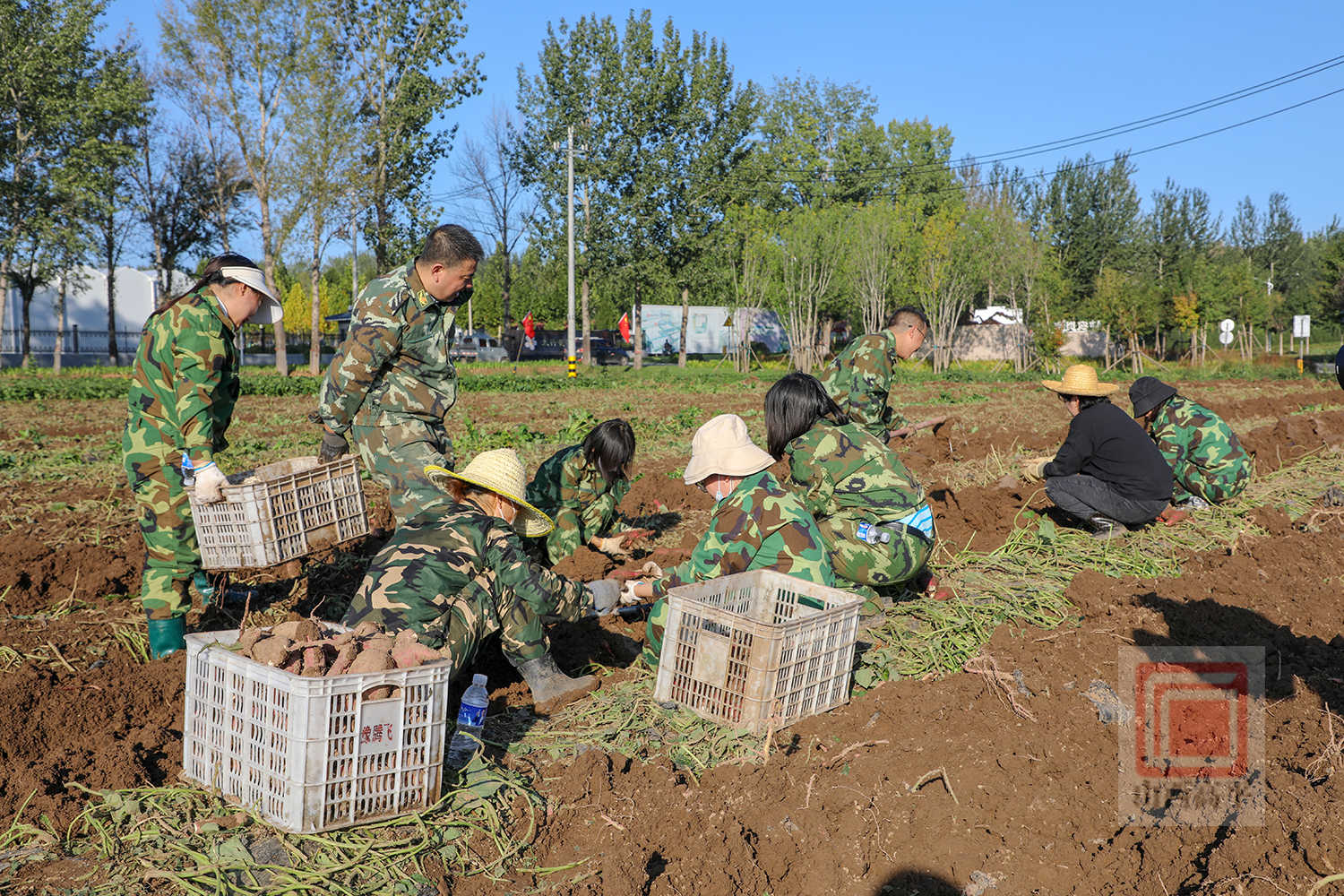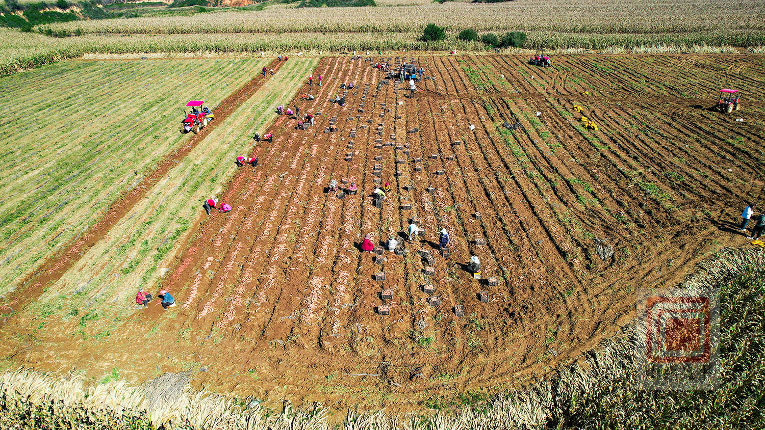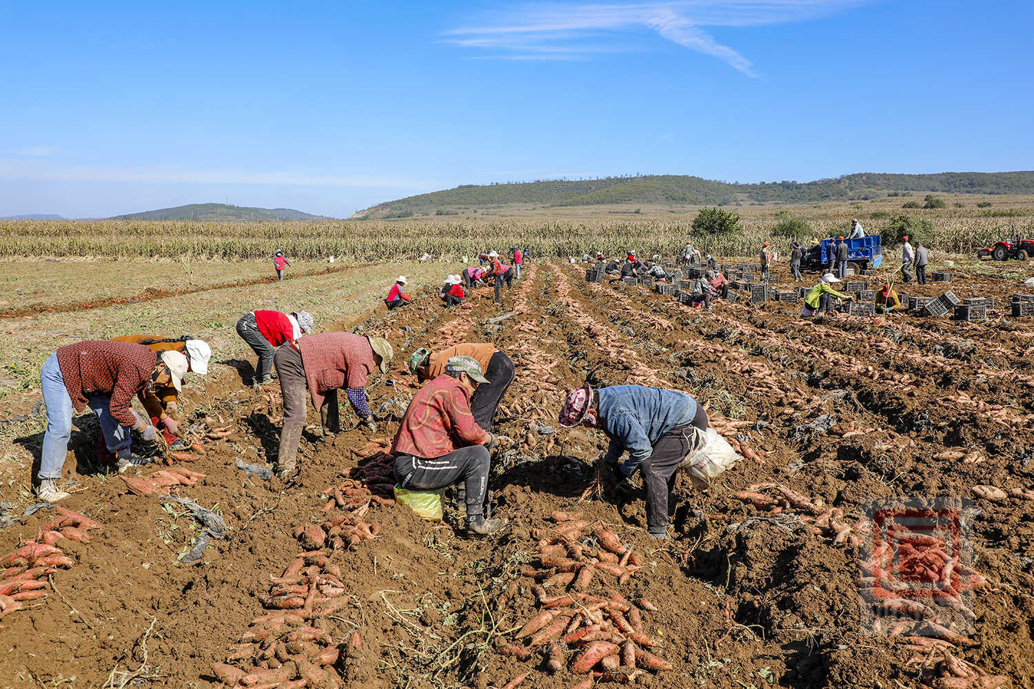 在石末乡寨平村的田间,也是一派抢收景象。宣武京种植专业合作社调配了1台红薯除秧机、1台红薯收获机,并组织70余名村民开展抢收作业。村民们紧跟在红薯收获机后面,随着红薯破土而出,大家翻捡、去泥、装筐、装车,动作麻利。两辆运输车往返运送,将一筐筐新鲜出土的红薯及时运往临时仓库进行晾干。