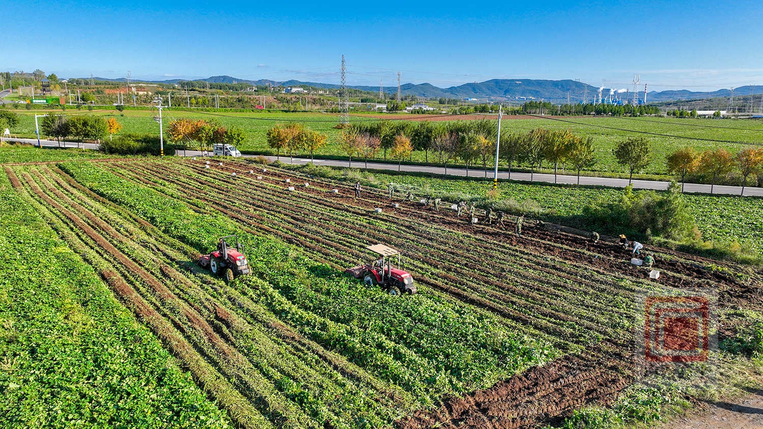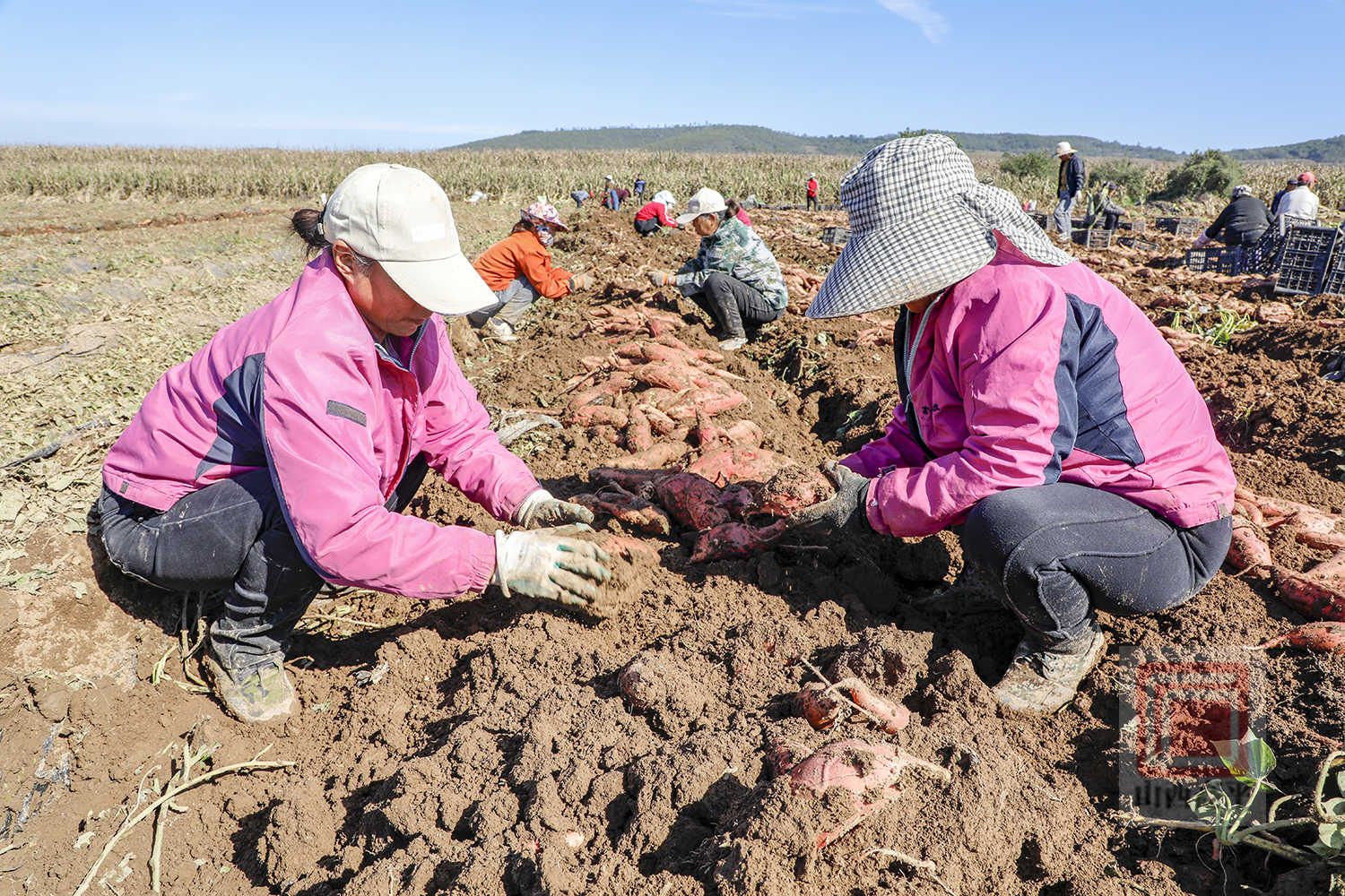 来到太行一号神农片区红薯种植基地,3台红薯收获机在田间来回穿梭作业,红薯抢收工作火热展开。伴随着收获机驶过湿软的土地,红薯从泥土中翻出。50多名工作人员分工协作,手持锄头翻刨土地、去泥、分拣、搬运红薯……整个抢收过程衔接有序,大家干劲十足。