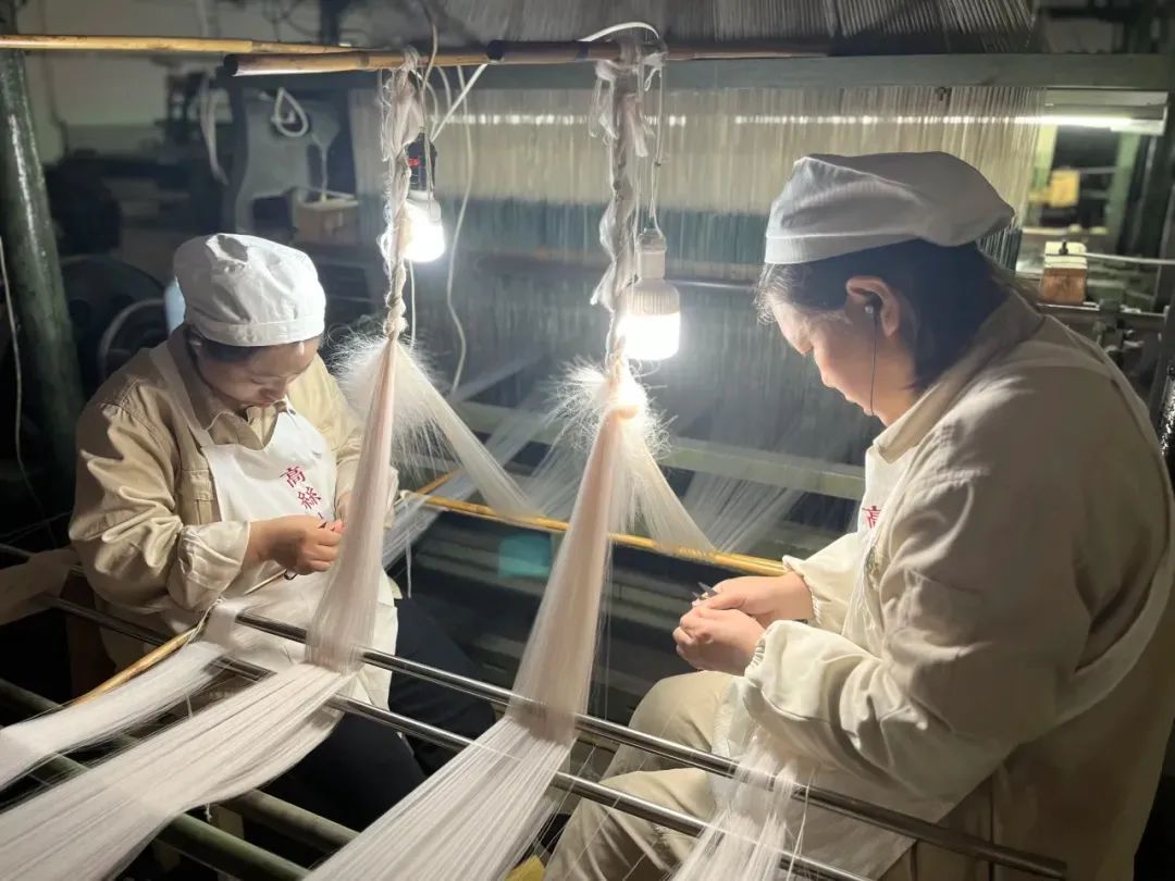 潞绸传统手工织造技艺传承千年之久,花样繁复,工艺细致,经纬交织,一套完整的工艺流程包括纹样设计、捻线、煮练漂白、丝线染色、络丝、织机装造、经纬织造、压经、接头、对丝、整理、修割、染色、烘干压光、检选等环节。“通常来说,完成一批潞绸成品至少需要三个月到半年的时间。”潞安府产品总监、录取通知书制作项目相关负责人吕慧说,团队年初织就一匹600米布料,正好适配复旦大学录取通知书的需求,“像是一种特别的缘分。”