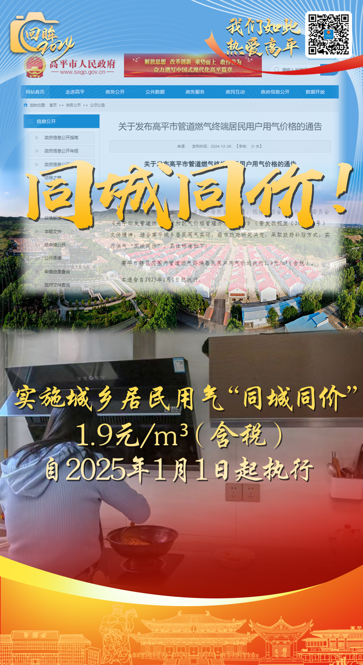 12月26日,高平市人民政府门户网站公布《关于发布高平市管道燃气终端居民用户用气价格的通告》,自2025年1月1日起,高平市辖区范围内管道燃气终端居民用户用气价,执行“同城同价”,均为1.9元/m³ (含税)。