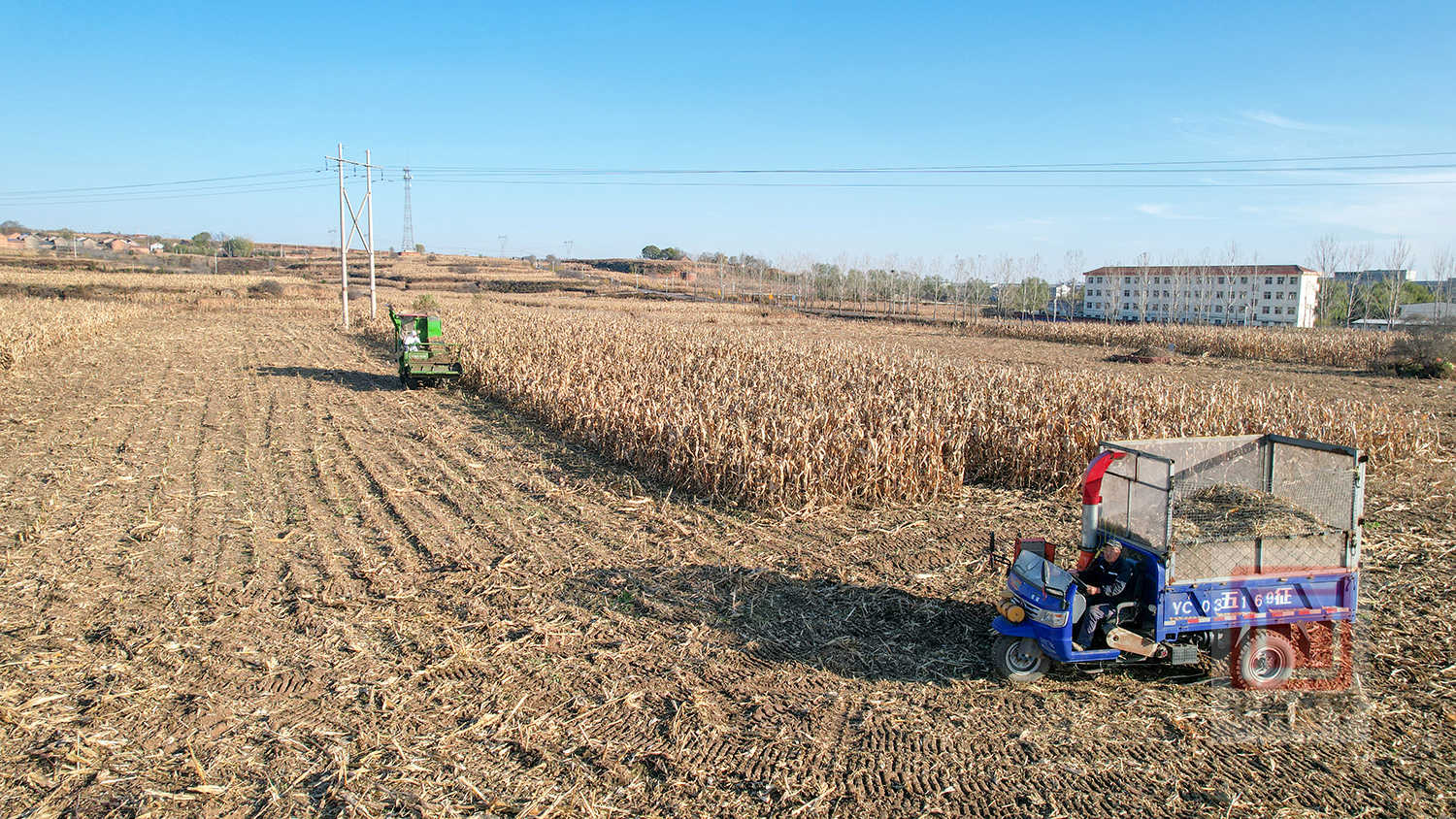 野川镇共有3.4万余亩玉米,投入了18台玉米秸秆粉碎机进行秋管作业。玉米秸秆粉碎还田机能够直接完成秸秆粉碎、还田、深翻、旋耕等多道工序。秸秆还田能在土壤中逐步转化为有机质,提升土壤保水保肥能力。同时,用于种羊饲料,节约了合作社的养殖成本。