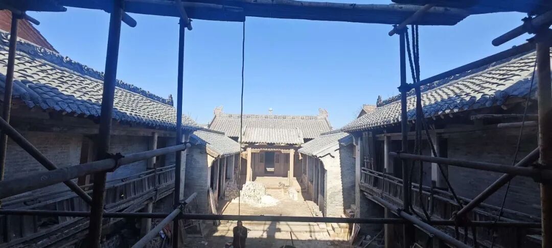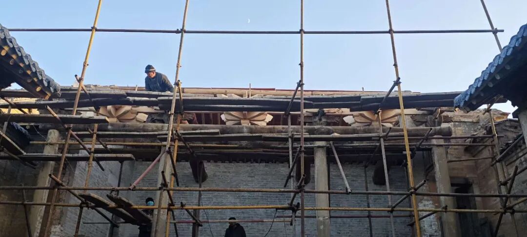 修缮过程中,村“两委”通过党员村民代表大会成立由多方代表组成的修缮委员会,全权负责工程监督、募资及资金监管,确保流程公开透明。工程推进以保护性修缮为核心,由村委出资完成房顶、门窗、排水系统等关键部位修缮,同时统筹募资完善配套设施,施工全程严管严控、精工匠造。目前,修缮工程正在如火如荼进行当中。这座承载着村庄数百年历史记忆与文化根脉的古老建筑,在历经岁月沧桑后即将重焕庄严风貌,让全村百姓心中满是自豪与期待,也为冬日的村庄增添了一抹新的希望。
