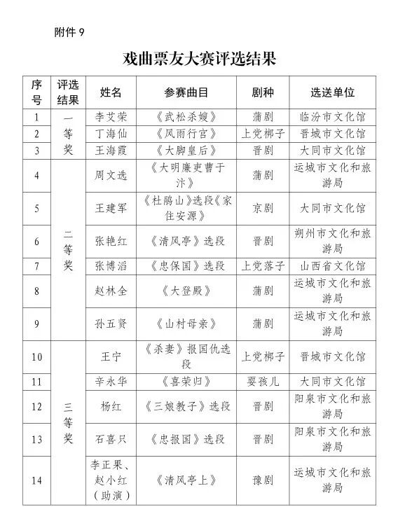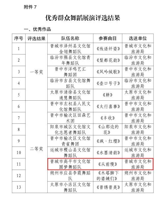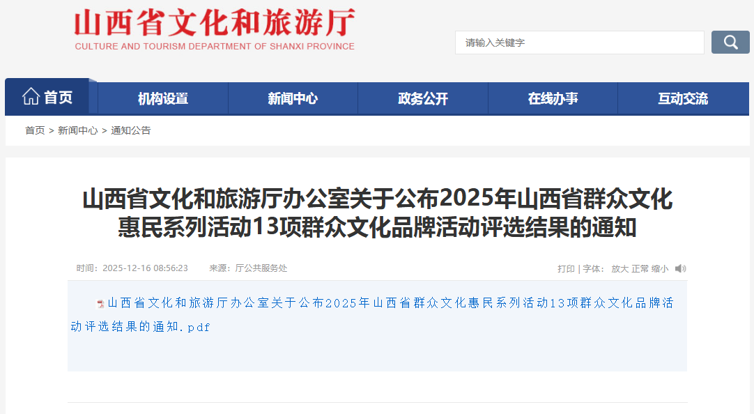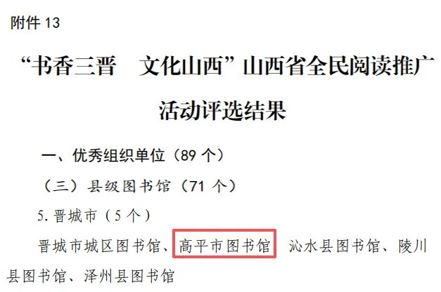 山西省群众文化品牌活动评选结果发布!我市多项活动获奖~ 来源:山西省文化和旅游厅 发布时间:2025-12-16 【字体:小 大】 如果内容不能正常显示,请更换浏览器进行重试 近日山西省文化和旅游厅公布2025年山西省群众文化惠民系列活动等13项群众文化品牌活动评选结果其中高平鼓书《谷子好》荣获优秀曲艺作品展演节目奖优秀奖高平市文化馆民族乐团《喜酒歌》荣获优秀器乐艺术展演二等奖高平市文化馆圆梦舞蹈队《从前慢》荣获优秀群众舞蹈展演优秀作品二等奖冯广信上党梆子《斩花堂》荣获戏曲票友大赛优秀奖高平市图书馆荣获山西省全民阅读推广活动优秀组织单位 本页二维码 【打印正文】