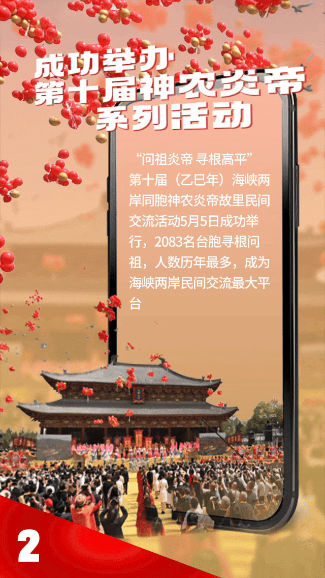 炎帝寻根聚两岸,同胞同心情更浓。“问祖炎帝 寻根高平”第十届(乙巳年)海峡两岸同胞神农炎帝故里民间交流活动5月5日成功举行,2083名台胞寻根问祖,人数历年最多。