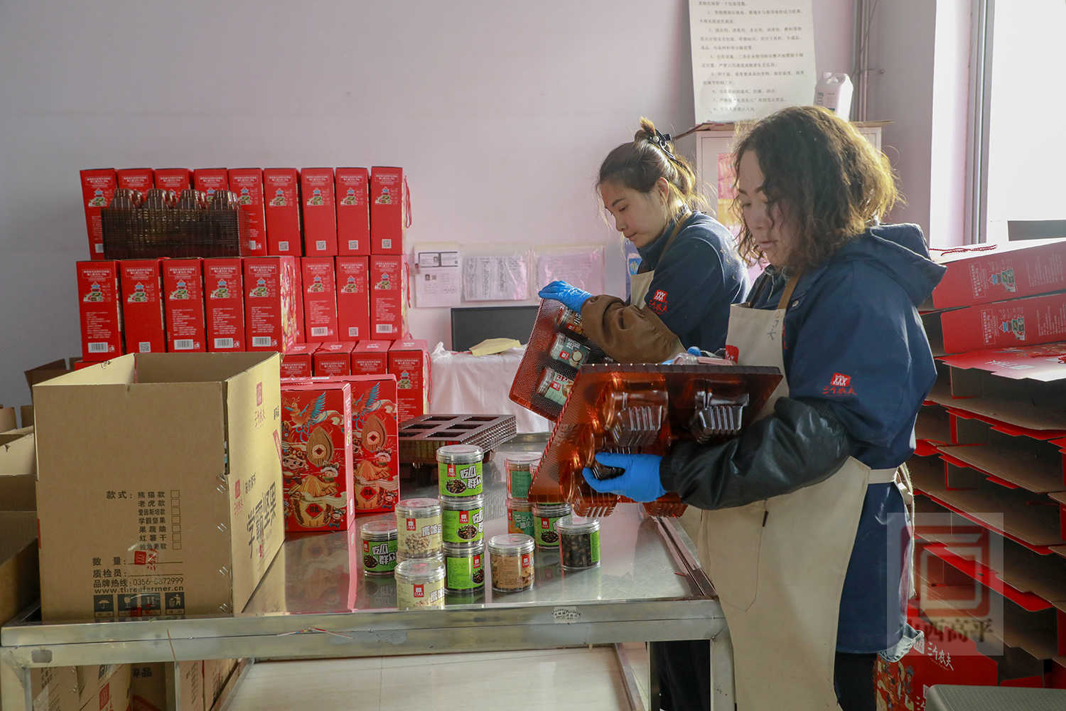 来到企业生产车间,工人们身着统一工装,在各自岗位上紧张有序忙碌,原料筛选、低温烘焙、分拣包装、礼盒组装等工序有序衔接。一盒盒精致的坚果礼盒不断下线、整齐码放,即将装车发往全国各地。
