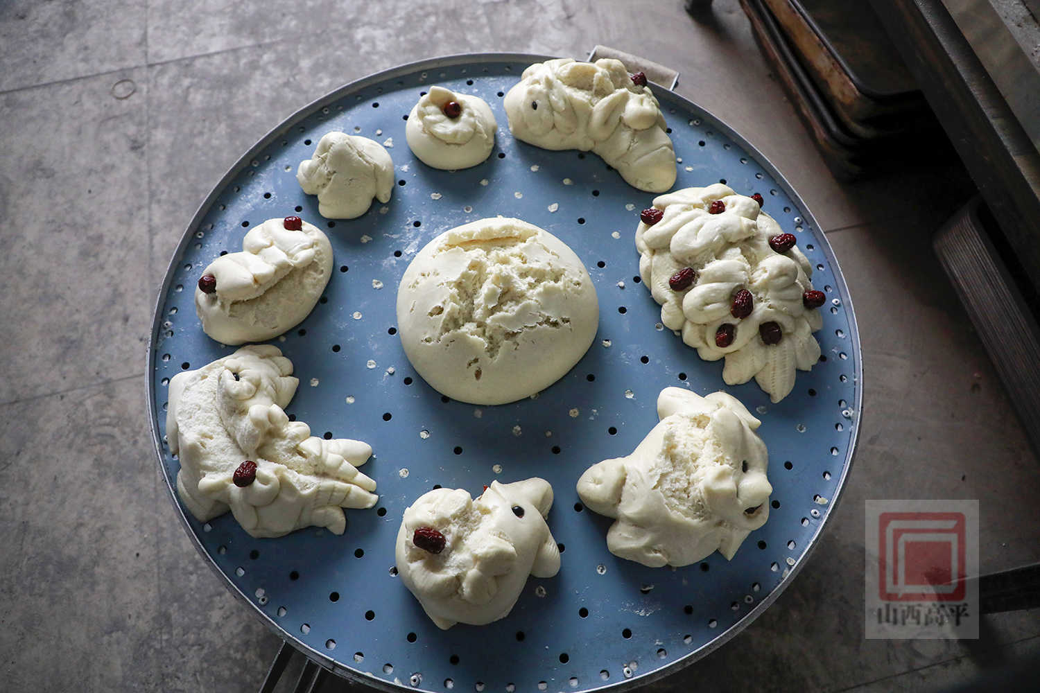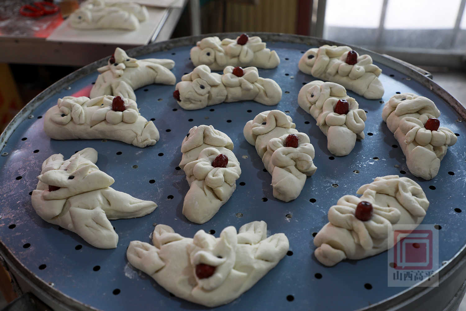 张会仙蒸制的猪、羊、兔、鸡、鱼等造型花馍,萌趣可爱,在高平方言中被称为耍戏馒头。这类馒头通常以动物或吉祥图案为造型,如寿桃、羊、猪、兔、鱼等,造型逼真,充满童趣和生活气息。