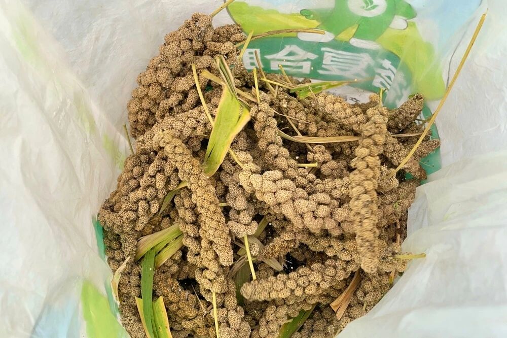 眼下抓紧收割的谷子品种是当地有名的“四明谷子好”,依托独特的口感和丰富的营养价值深受消费者青睐。2025年南诗午村共种植100亩谷子,受阴雨天气影响,亩产大概200公斤,预计可收1.5万—2万公斤。