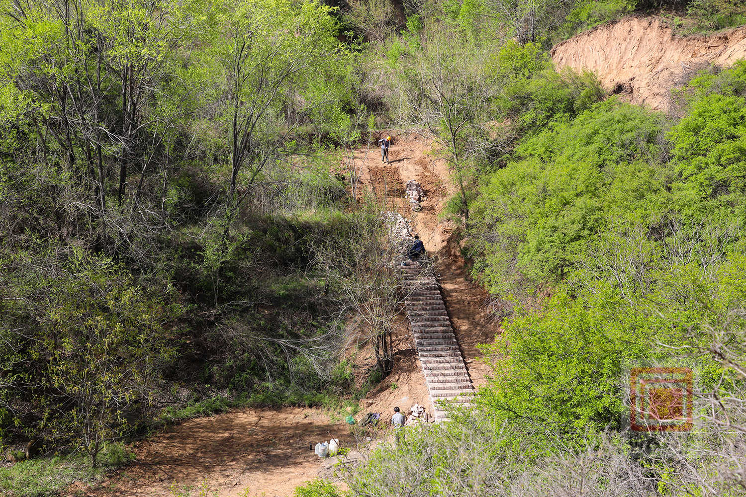 四月的南河村,山花烂漫,生机盎然。山林间,工人师傅们正抢抓春日好时节,分散在各个作业点,顺着山势有序开展路基修整、石阶铺设、草屋搭建等作业,处处一派热火朝天的春日施工景象。