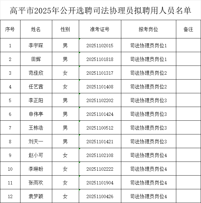 我市2025年公开选聘司法协理员已完成笔试、面试、体检、考察等选聘程序,经高平市司法协理员制度试点工作领导组办公室研究,确定李宇琛等12名同志为拟聘用人员。现将拟聘用人员名单予以公示,公示时间为5个工作日(2026年1月4日至2026年1月8日)。如果你了解下列公示人员在思想政治、遵纪守法、资格条件等方面存在问题,请向高平市司法协理员制度试点工作领导组办公室反映。
