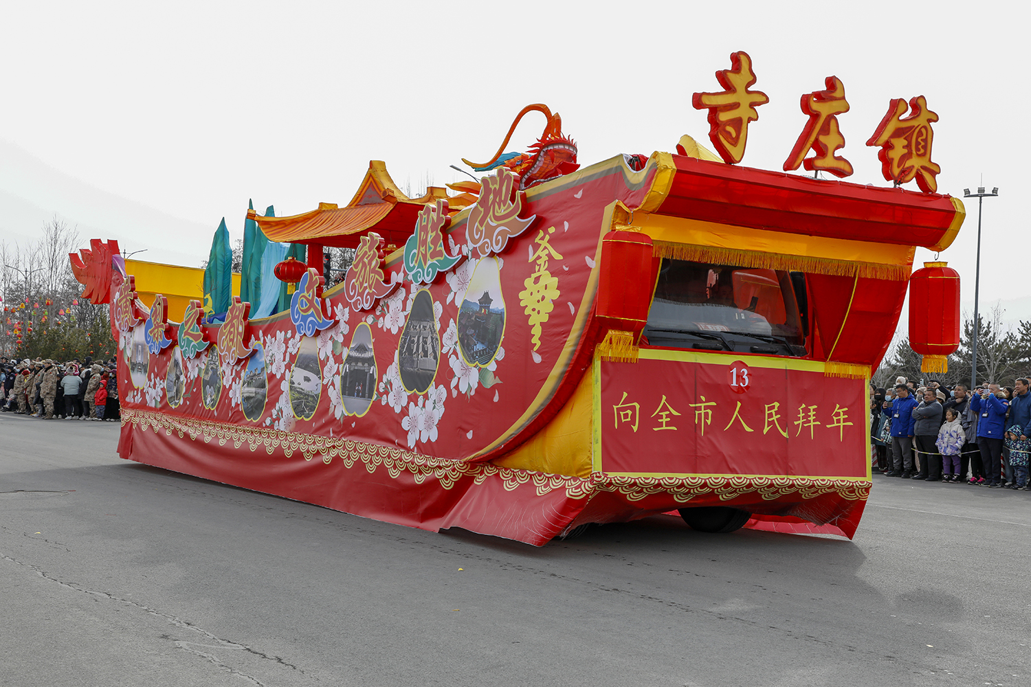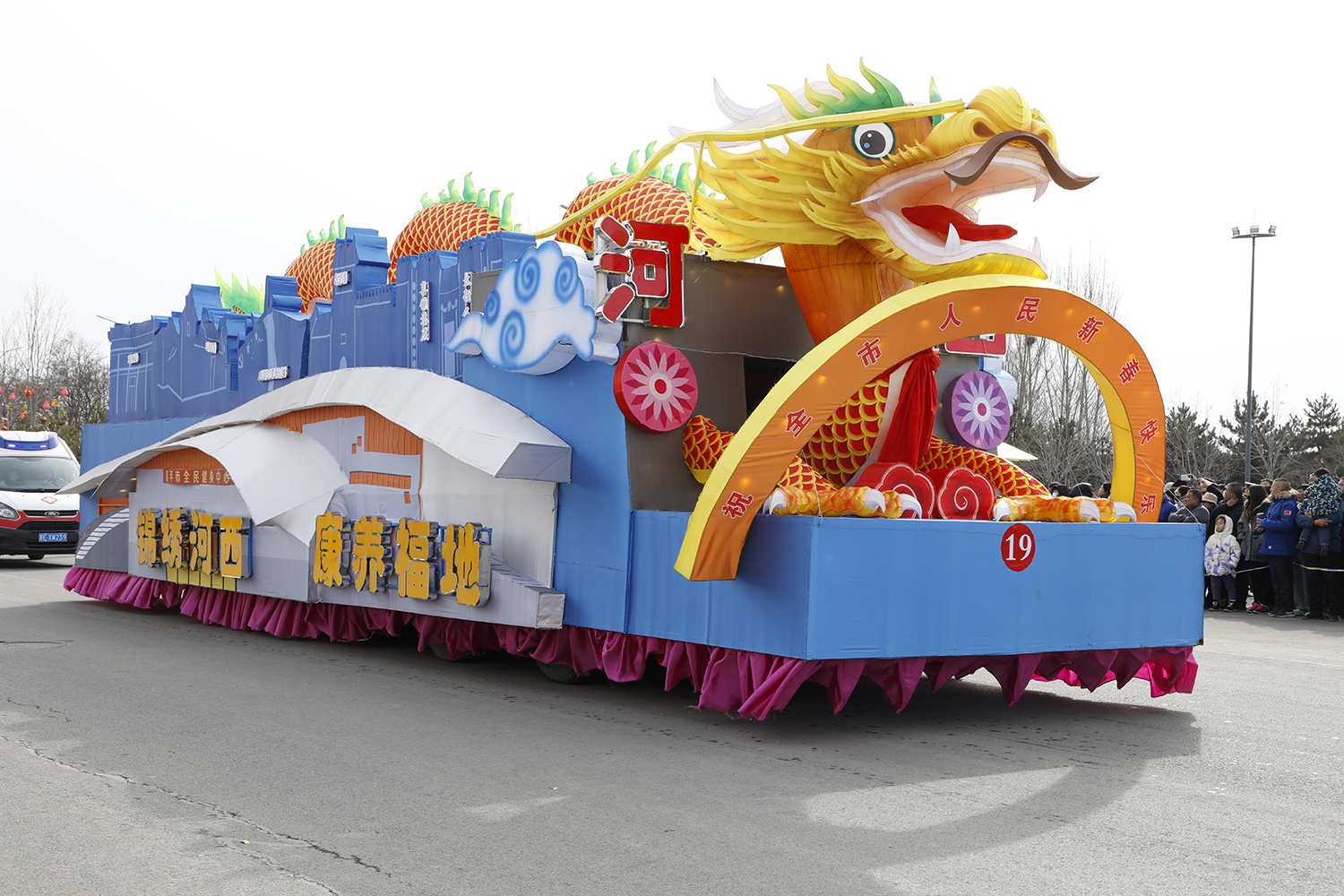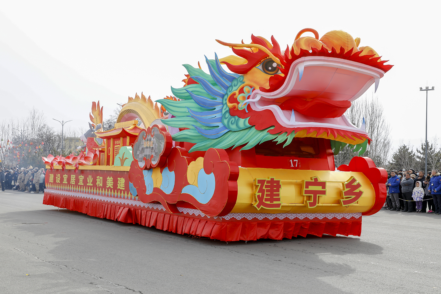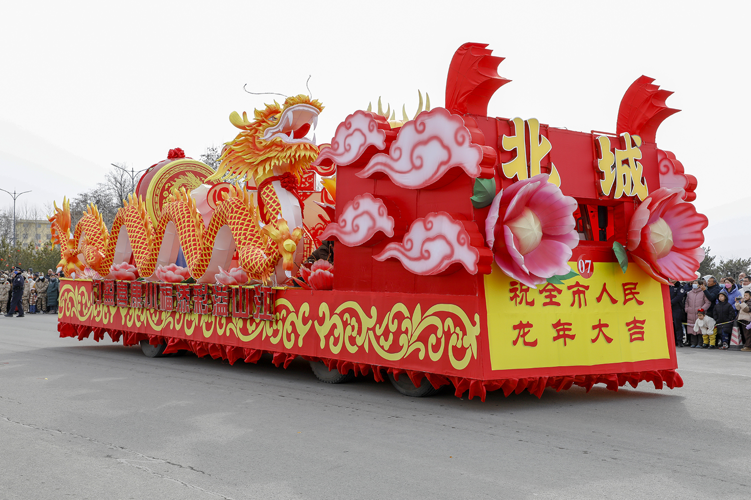 彩车围绕“新春新年新干劲”为主题进行设计并制作。两条巨龙昂首向前,立体玲珑的新春彩灯放置于彩车中央,直径两米的巨型大鼓放置于花车尾部,可谓是:双龙戏珠吉祥年,春回大地万物新。战鼓擂动声雄壮,北城儿女天下先!