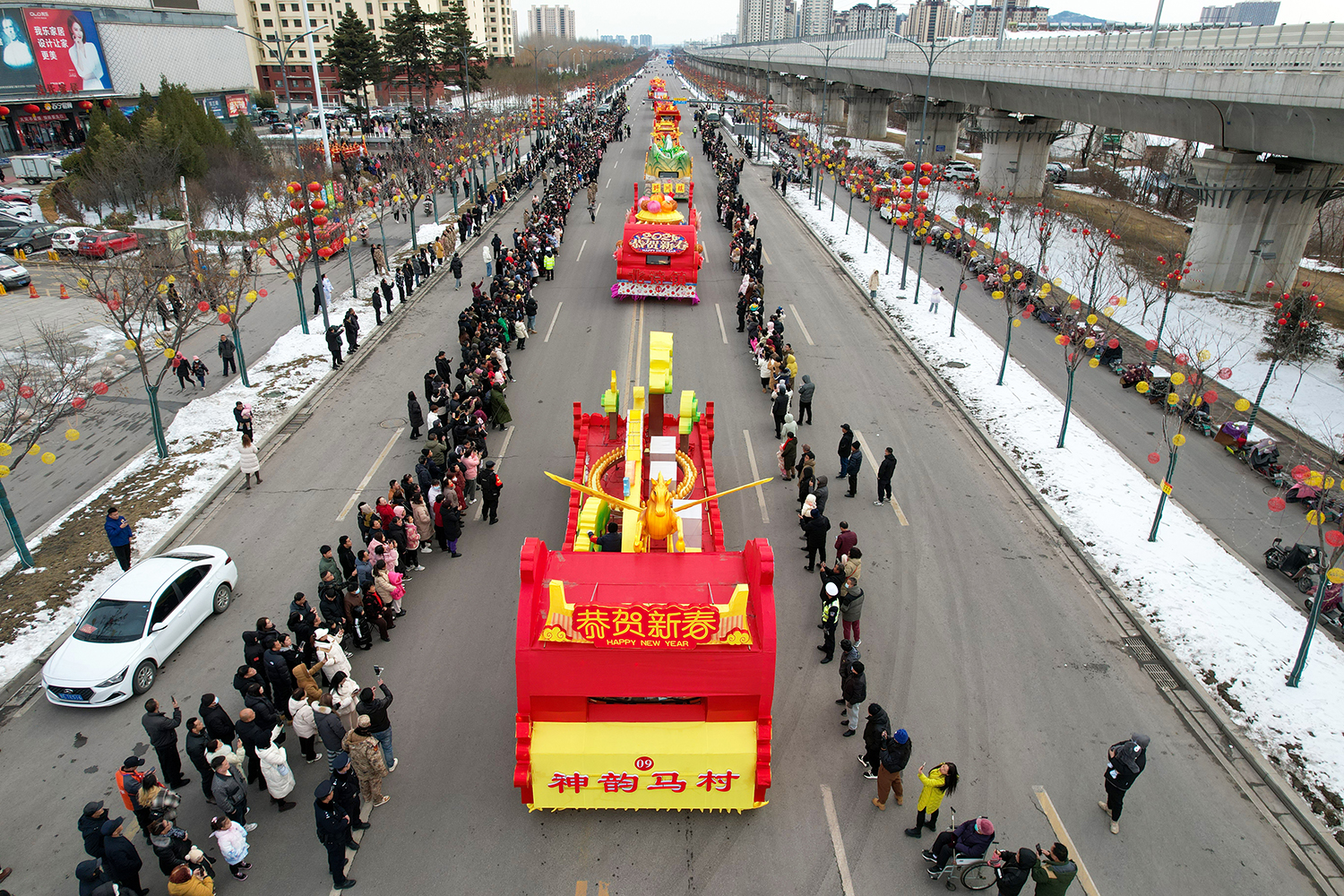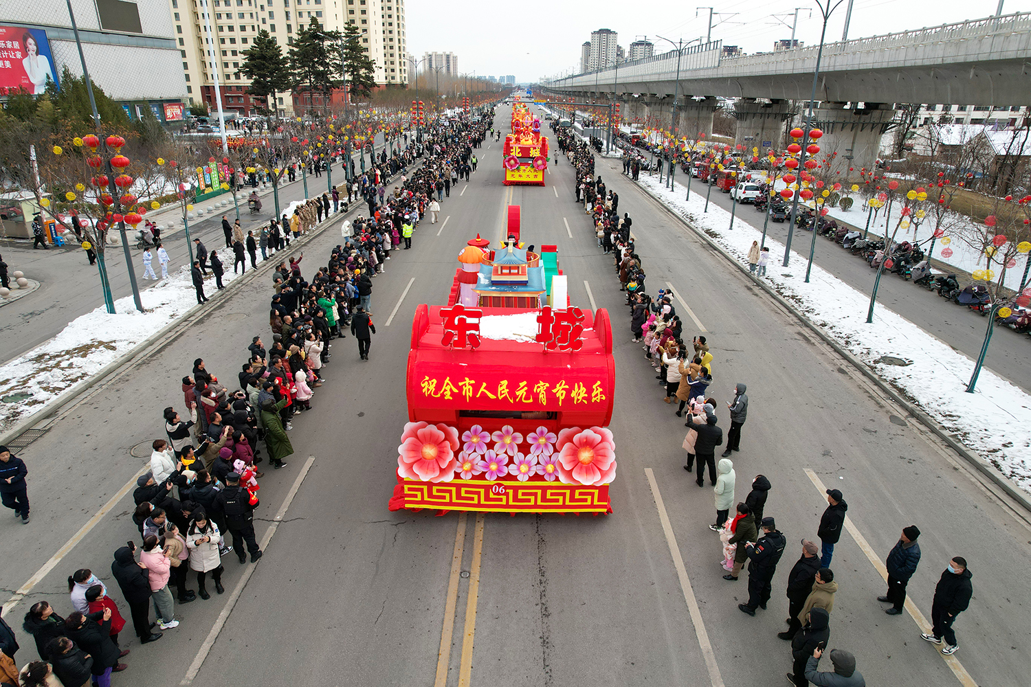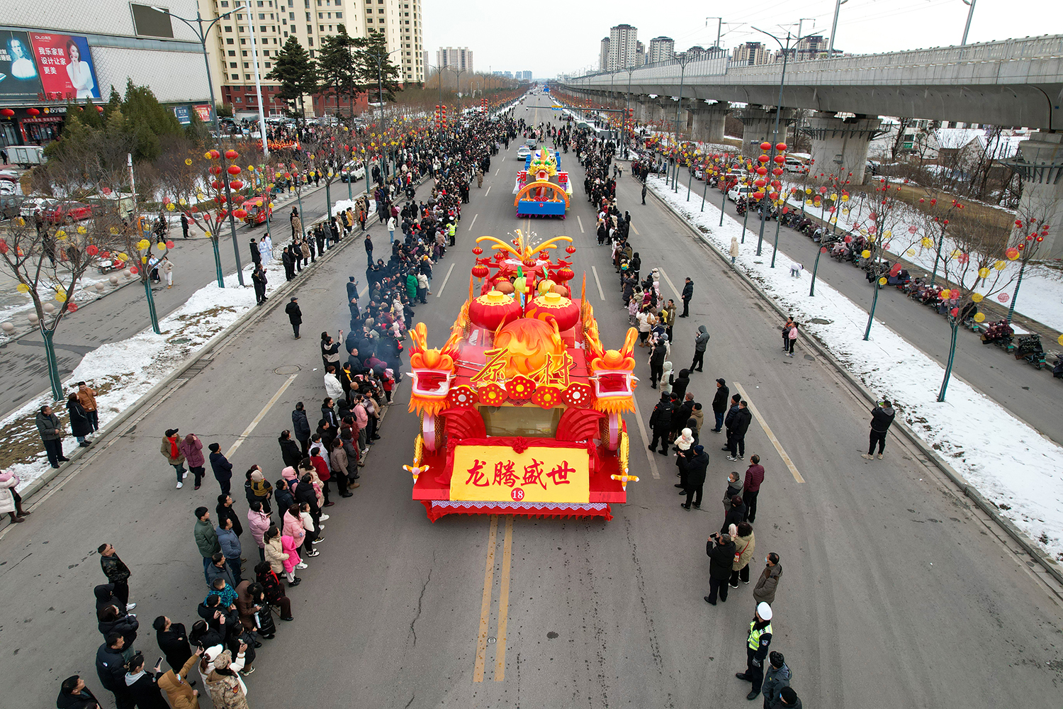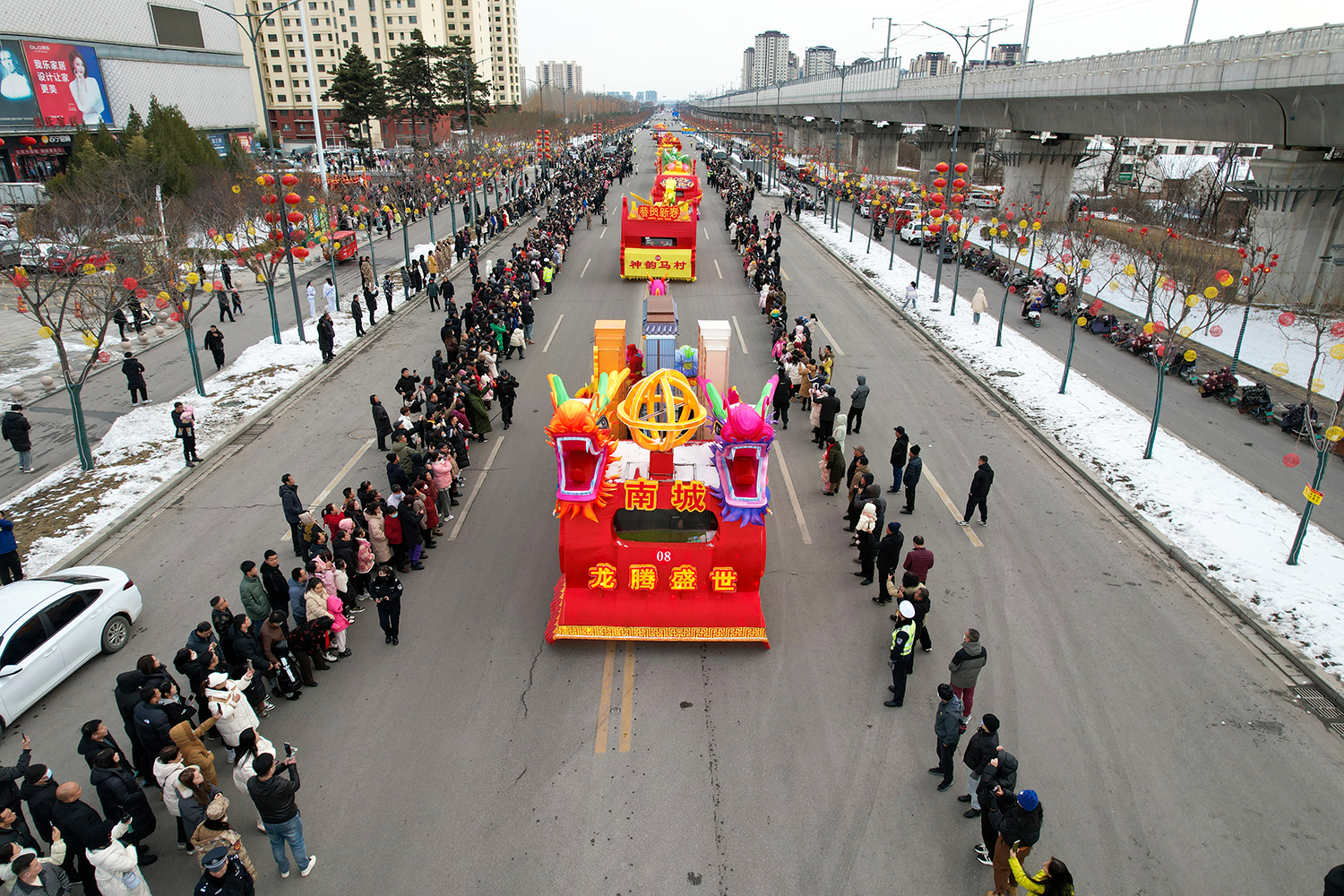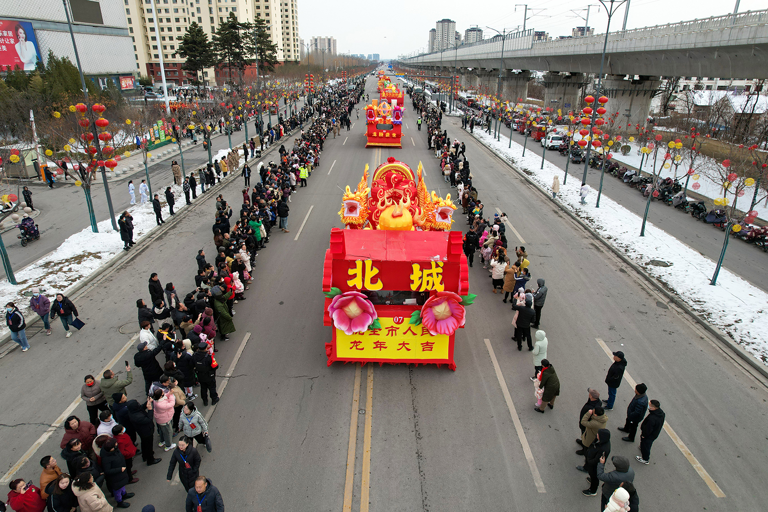 彩车围绕“新春新年新干劲”为主题进行设计并制作。两条巨龙昂首向前,立体玲珑的新春彩灯放置于彩车中央,直径两米的巨型大鼓放置于花车尾部,可谓是:双龙戏珠吉祥年,春回大地万物新。战鼓擂动声雄壮,北城儿女天下先!