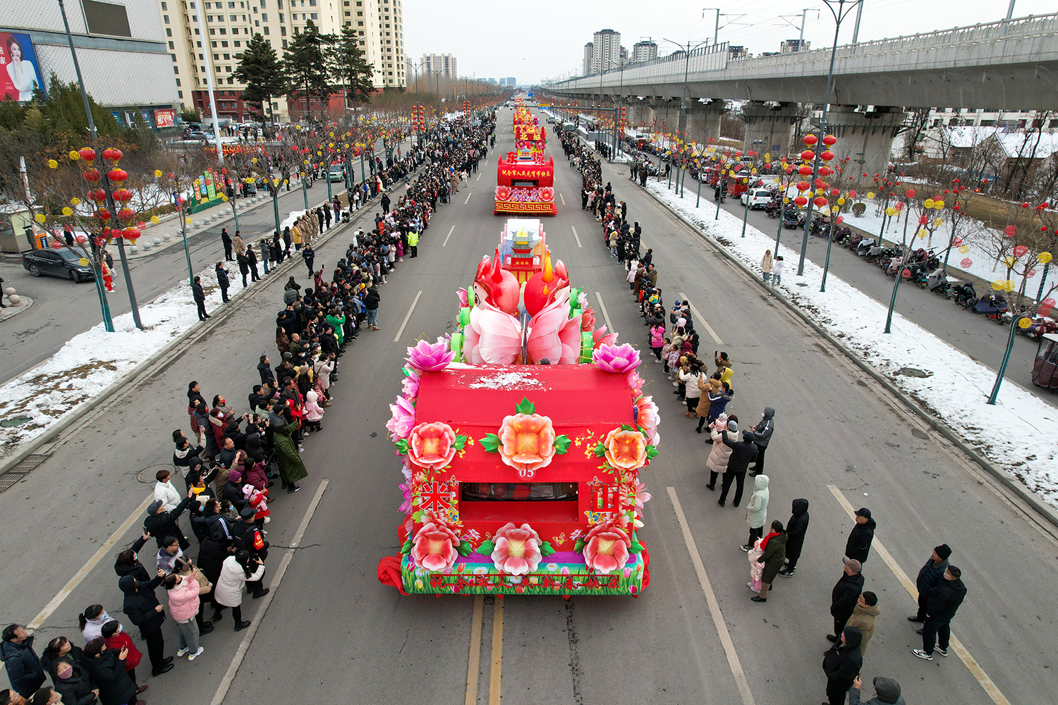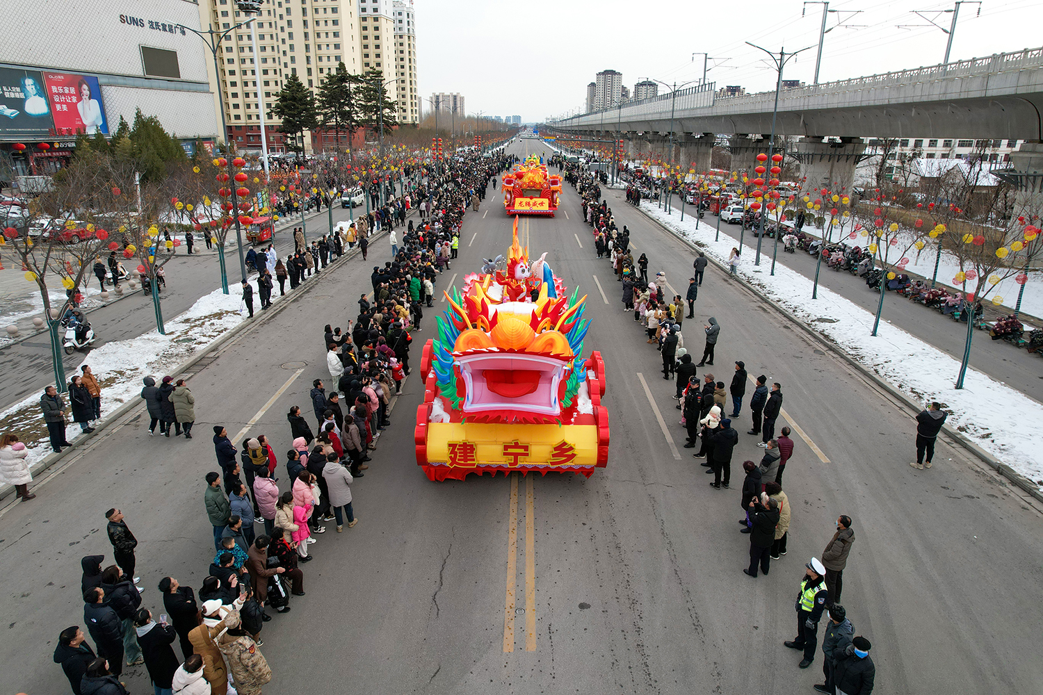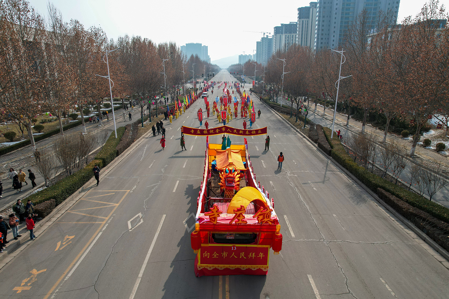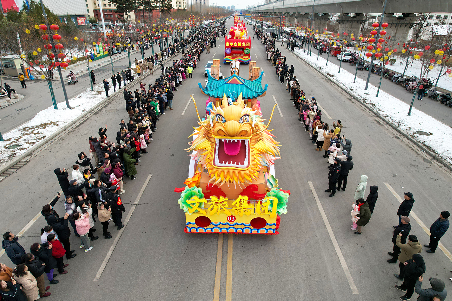 彩车围绕“新春新年新干劲”为主题进行设计并制作。两条巨龙昂首向前,立体玲珑的新春彩灯放置于彩车中央,直径两米的巨型大鼓放置于花车尾部,可谓是:双龙戏珠吉祥年,春回大地万物新。战鼓擂动声雄壮,北城儿女天下先!