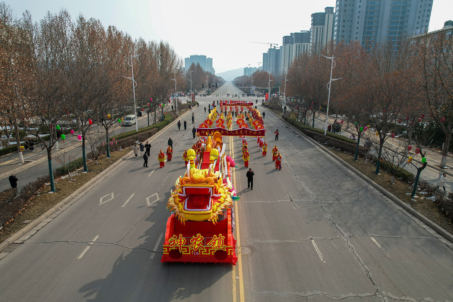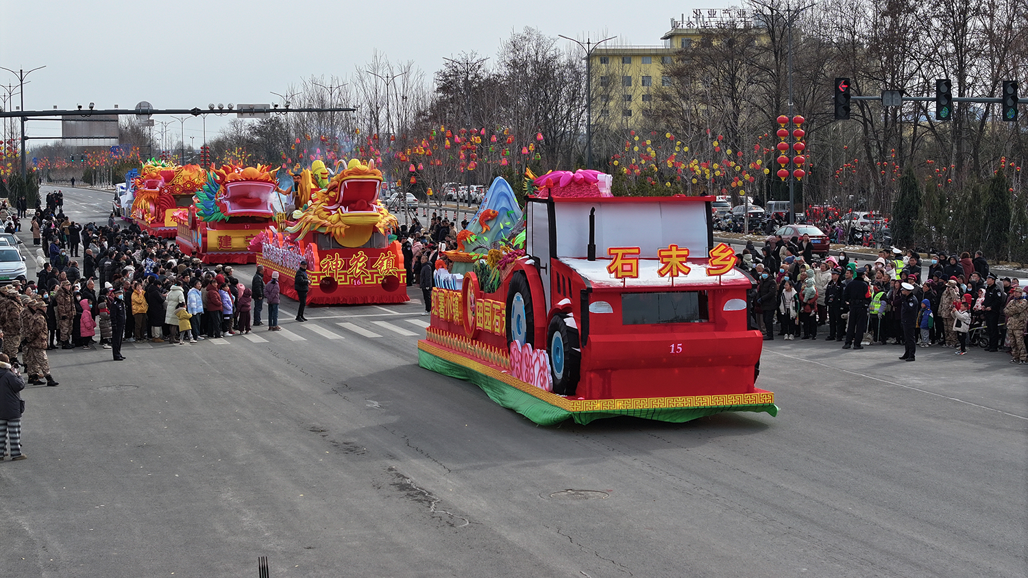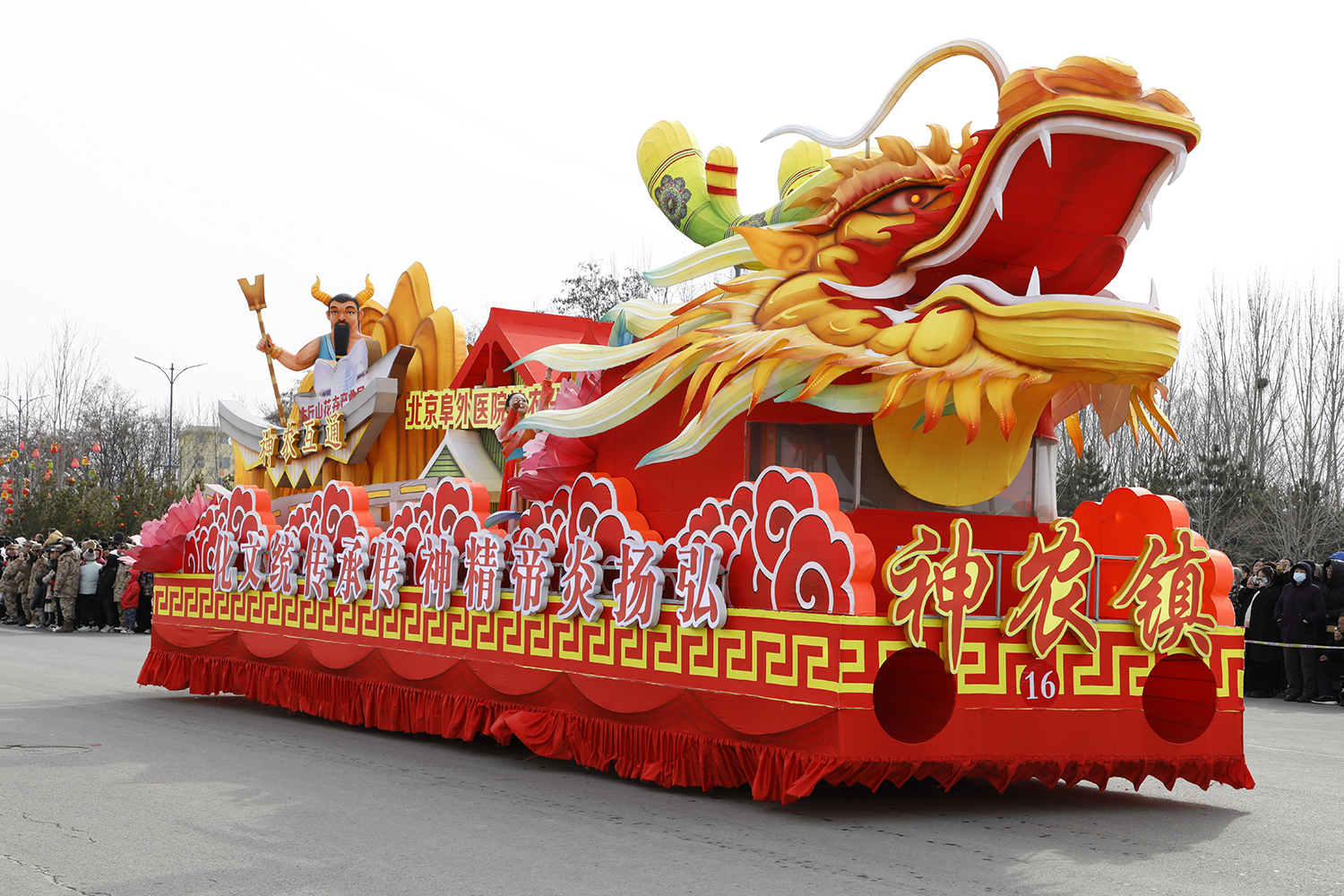 彩车主要展现炎帝文化、本土特色和近年来神农镇经济社会发展成果。车头以龙头为主,体现了龙年神农发展的昂扬气势。车身主要通过神农互通、羊头山、太行山花卉产业园等元素呈现,寓意神农镇将持续弘扬炎帝精神,传承传统文化,践行千万工程,助推乡村振兴。