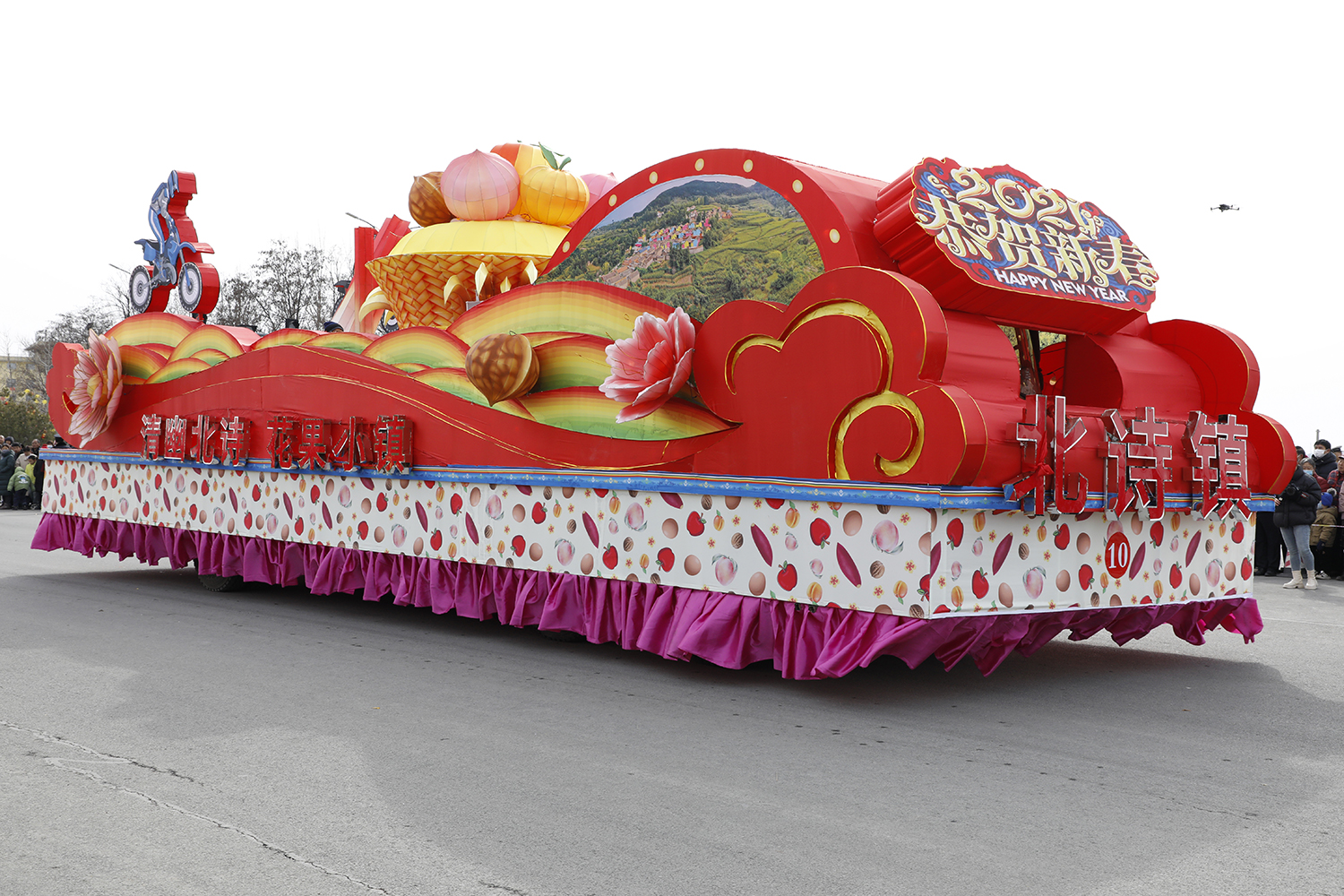 “清幽北诗 花果小镇”彩车,以“盛世花篮”为主题形象,盛有苹果、核桃、桃子以及各色鲜花,寓意着新的一年更加吉祥、富足和美好。