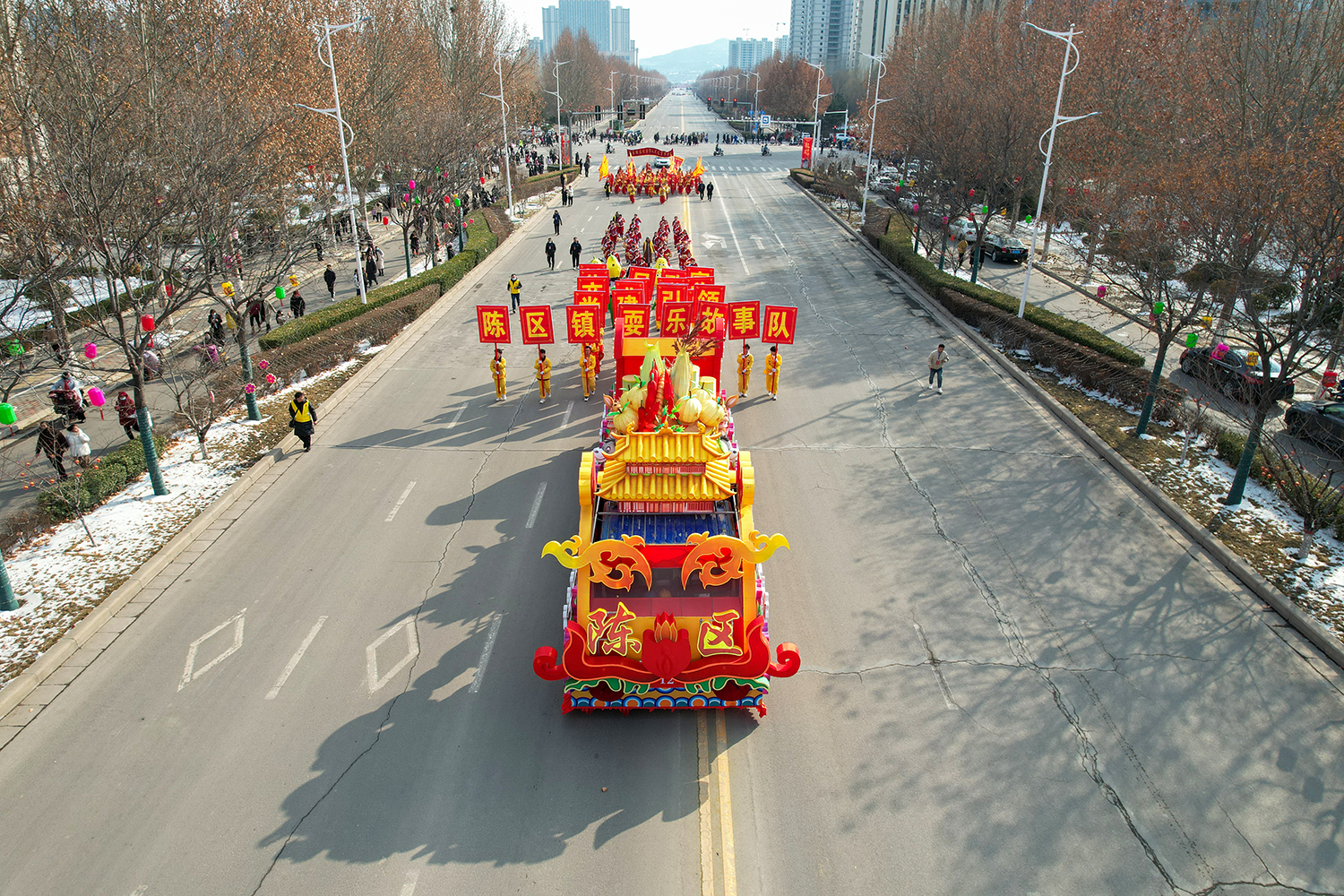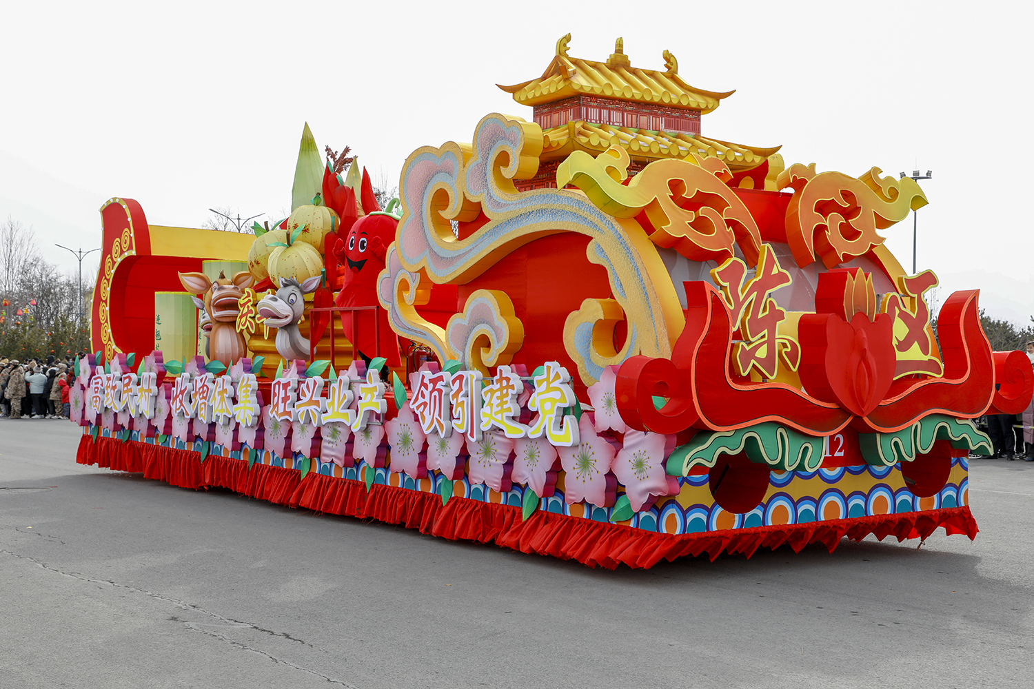 “庆丰年”主题彩车,以古建国保开化寺为元素,融入铁炉贡梨、菊花、辣椒、关山驴等特色产业元素,以别致的造型展现陈区镇党建引领,产业兴旺,集体增收,村民致富的美好寓意。