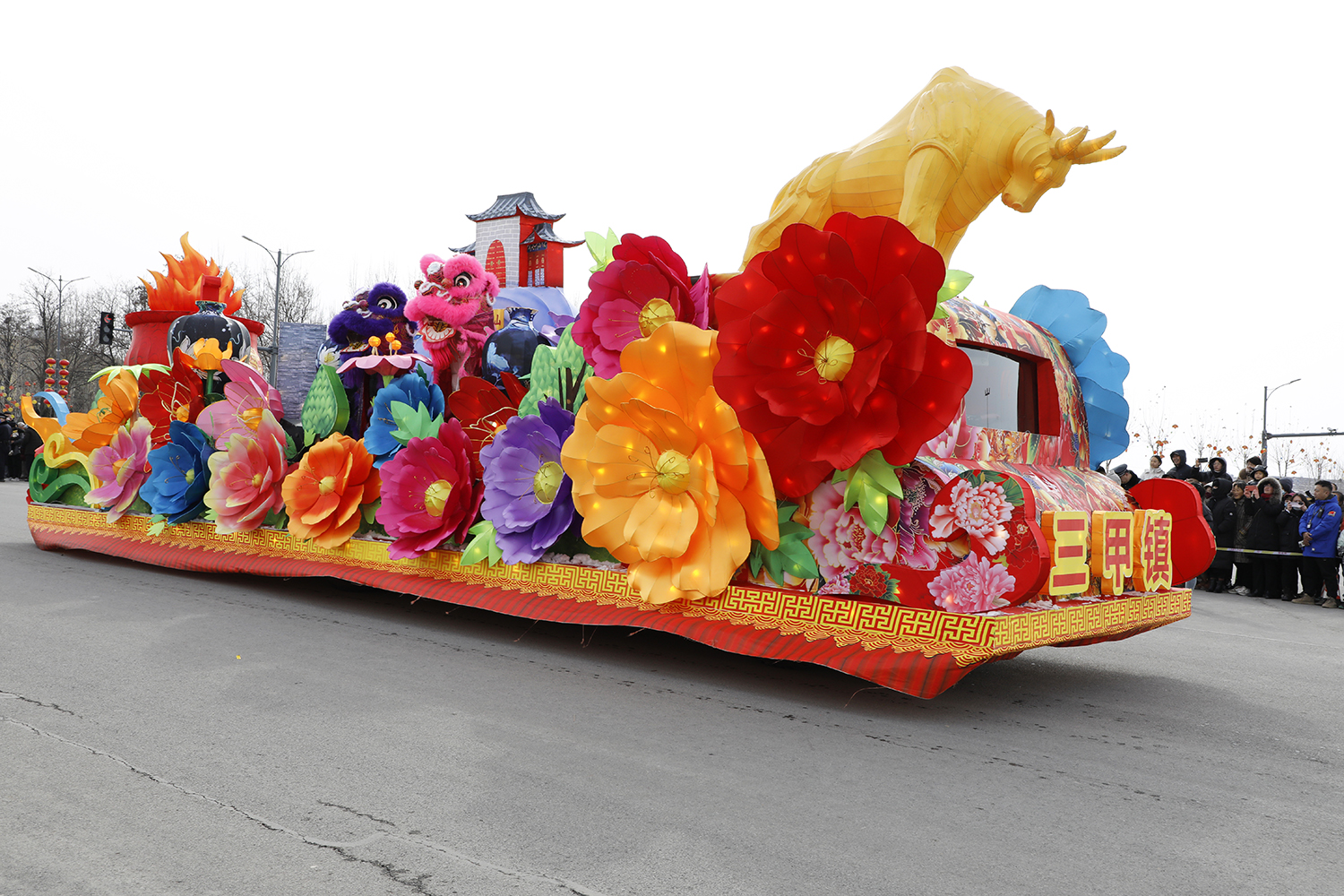 彩车头部是一头“三角金牛”,体现了三甲镇党员干部“为民服务孺子牛、创新发展拓荒牛、艰苦奋斗老黄牛”的“三牛”精神。整个车身由牡丹、珐华器、三甲鼎、汤王山组成,体现的是三甲镇的“四张名片”,即珐华器、千亩牡丹、冶炼铸造和休闲康养。