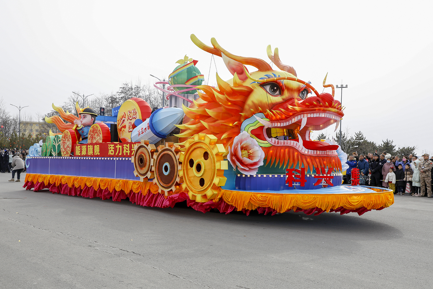 以“能源旗舰 奋进科兴”主题、甲辰龙年元素进行设计。彩车以红、蓝为主色调,展示科兴活力四射、蓬勃发展,尽显生机。启航2024,科兴集团将振奋龙马精神,以龙腾虎跃、鱼跃龙门的干劲闯劲,开拓创新、拼搏奉献,奋力书写高质量发展新篇章!