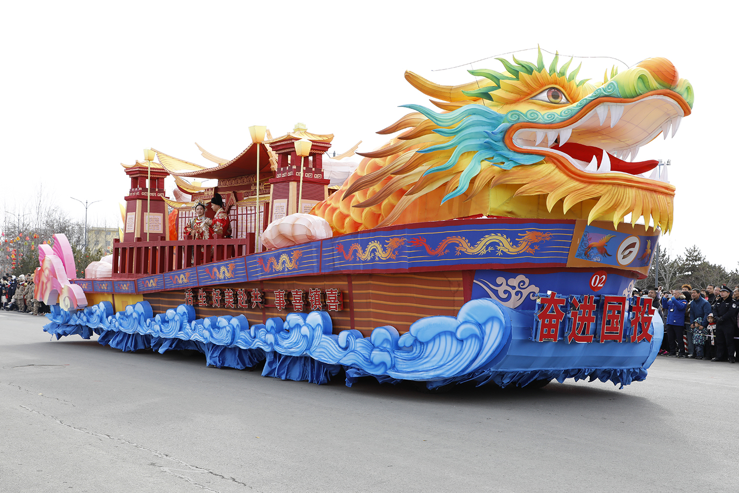 彩车整体造型使用古典元素,浪花展现国投集团乘风破浪,奋力前行的景象。龙头寓意国投集团是我市龙头企业,中部为喜镇苏庄中式婚礼堂,船尾为彩虹龙尾寓意着追求更加美好的未来。2024年,国投集团将继续聚焦更有能力干成大事要事,为高平高质量发展贡献国投力量。