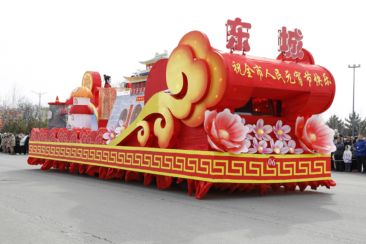 彩车设计紧紧围绕“龙腾虎跃建东城”主题,融合“寻梦小镇”沟北村、“长平不夜城”东山村、“康养小镇”果则沟等重点乡村项目进行设计并制作。彩车尾部安装模拟大鼓一面,寓意兴盛、奋进的新春鼓舞之意。