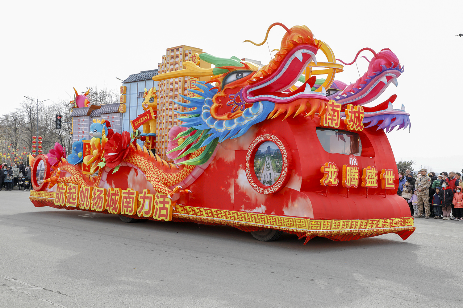 花车以龙腾盛世为主题,整体造型为龙舟形状,花车车头两条彩龙簇拥着一颗金色龙珠踏浪前行,车身突出了南城瓦窑头、智创城、龙渠回迁安置楼等标志性景点和建筑,花车底部仿若乘风行走于海洋之中,寓意新的一年,全体南城人民将在市委、市政府的坚强领导下,奋力书写高质量发展新篇章。