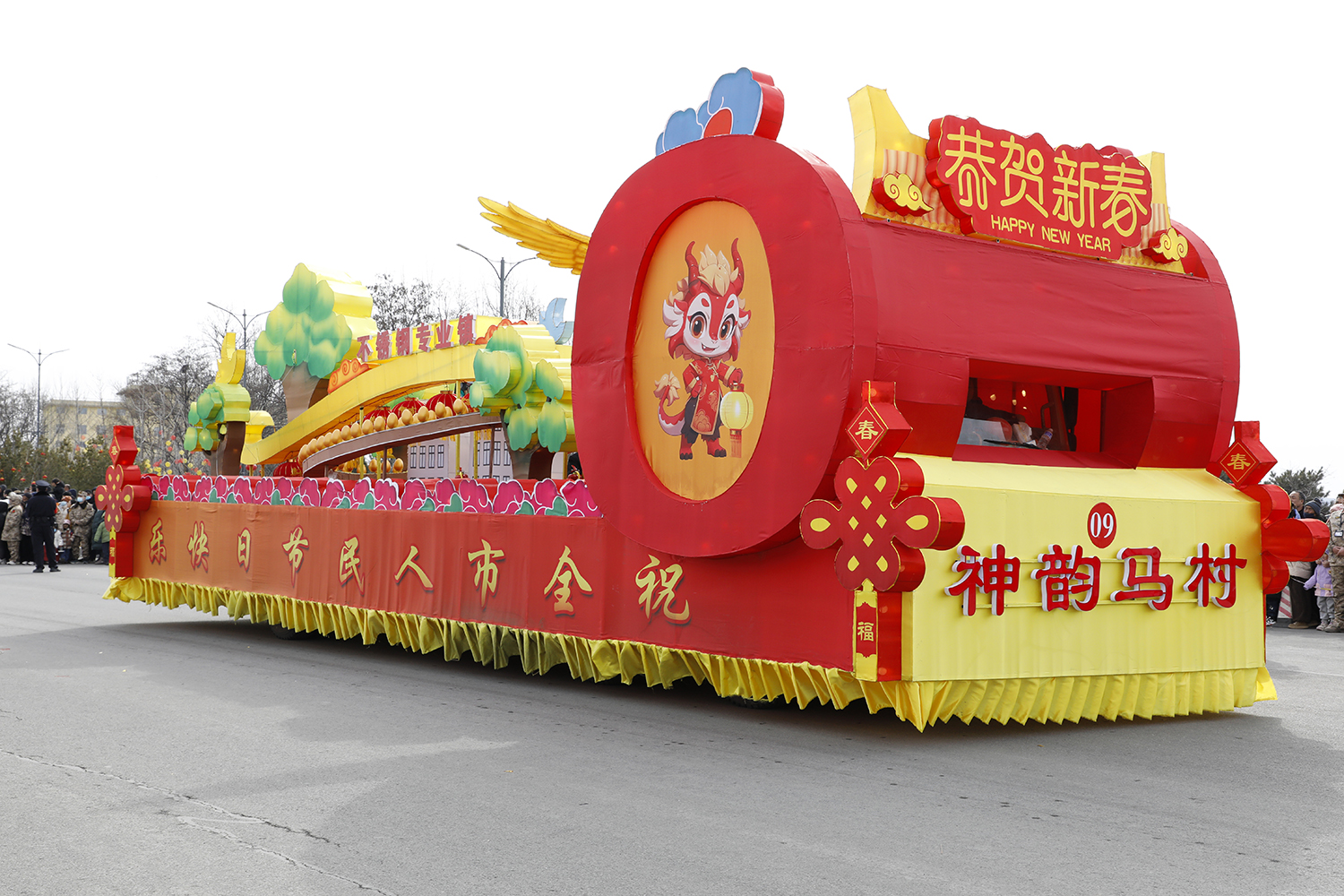 贺岁彩车以“赵輖故里、神韵马村、生态家园、经济强镇”四张名片为主题进行设计,充分展现了马村镇踔厉奋发、一往无前、吃苦耐劳的奋斗精神和“综合实力跻身全省第一方阵”这一宏伟蓝图。
