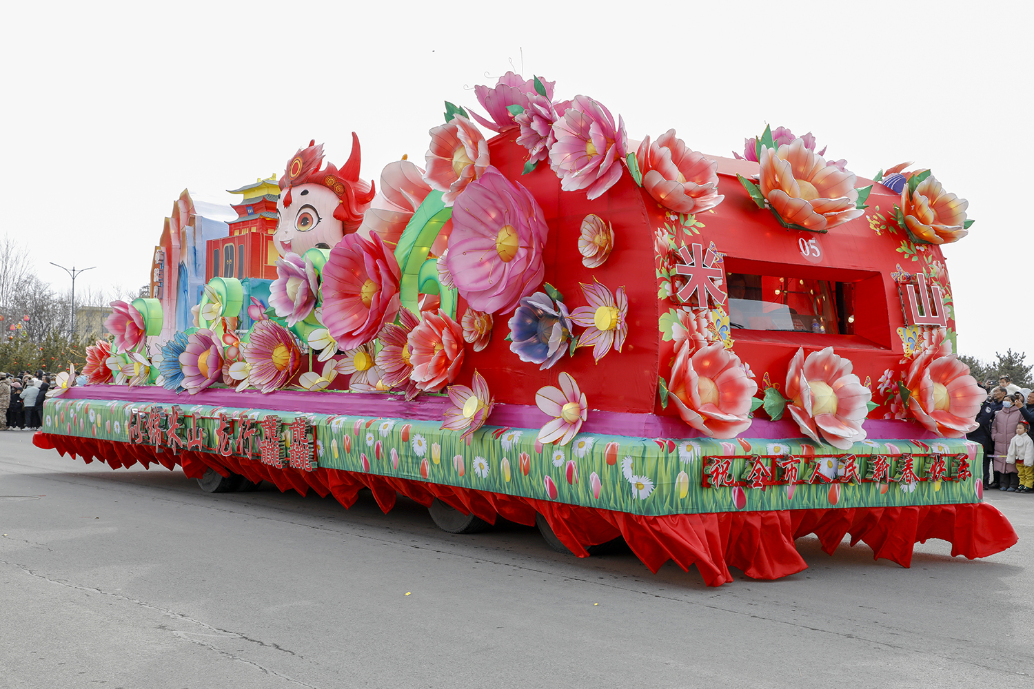 彩车以可爱的卡通龙形象和国家AAA级景区大粮山为主,繁花和定林寺为辅,再予以灯光照射,使得彩车更加明亮动人,象征似锦米山,千帆竞发,行步顺遂!