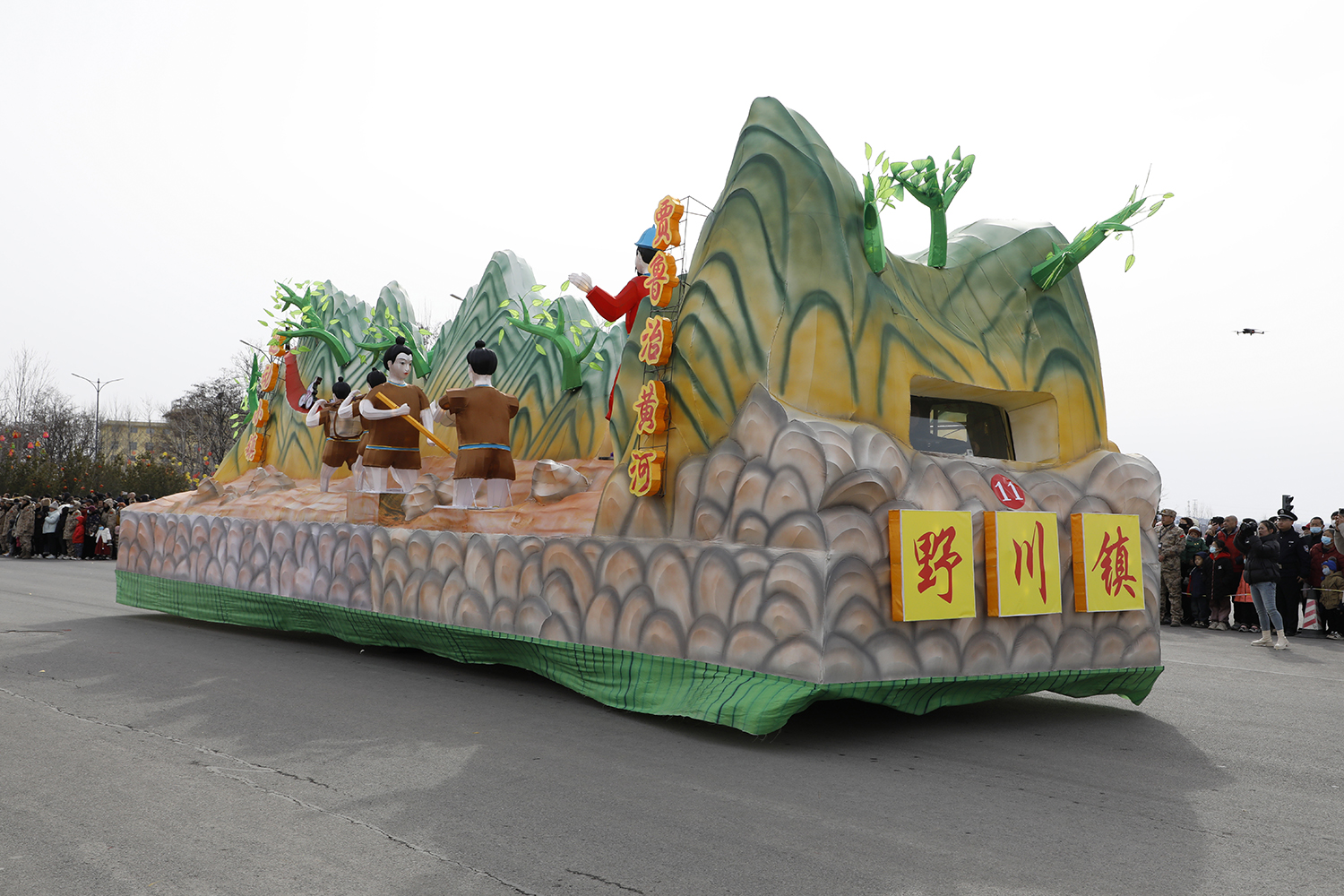 彩车以野川镇圪台山红色骑行赛道为背景,采用传统工艺和现代制作手段及光影技术展示了贾鲁治黄河的恢弘场景。旨在大力弘扬贾鲁清正廉洁、一心为民的家国情怀和不畏艰难、勇于拼搏的治黄精神。