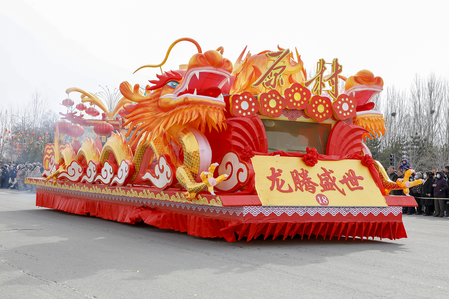 “双龙戏珠 乡村振兴”花车,车头设计有“原村”字样,左右各有一条腾云祥龙攀附,“原村”字样上方是一颗灵动的火珠,象征着原村乡各项事业发展蒸蒸日上,百姓生活红红火火。
