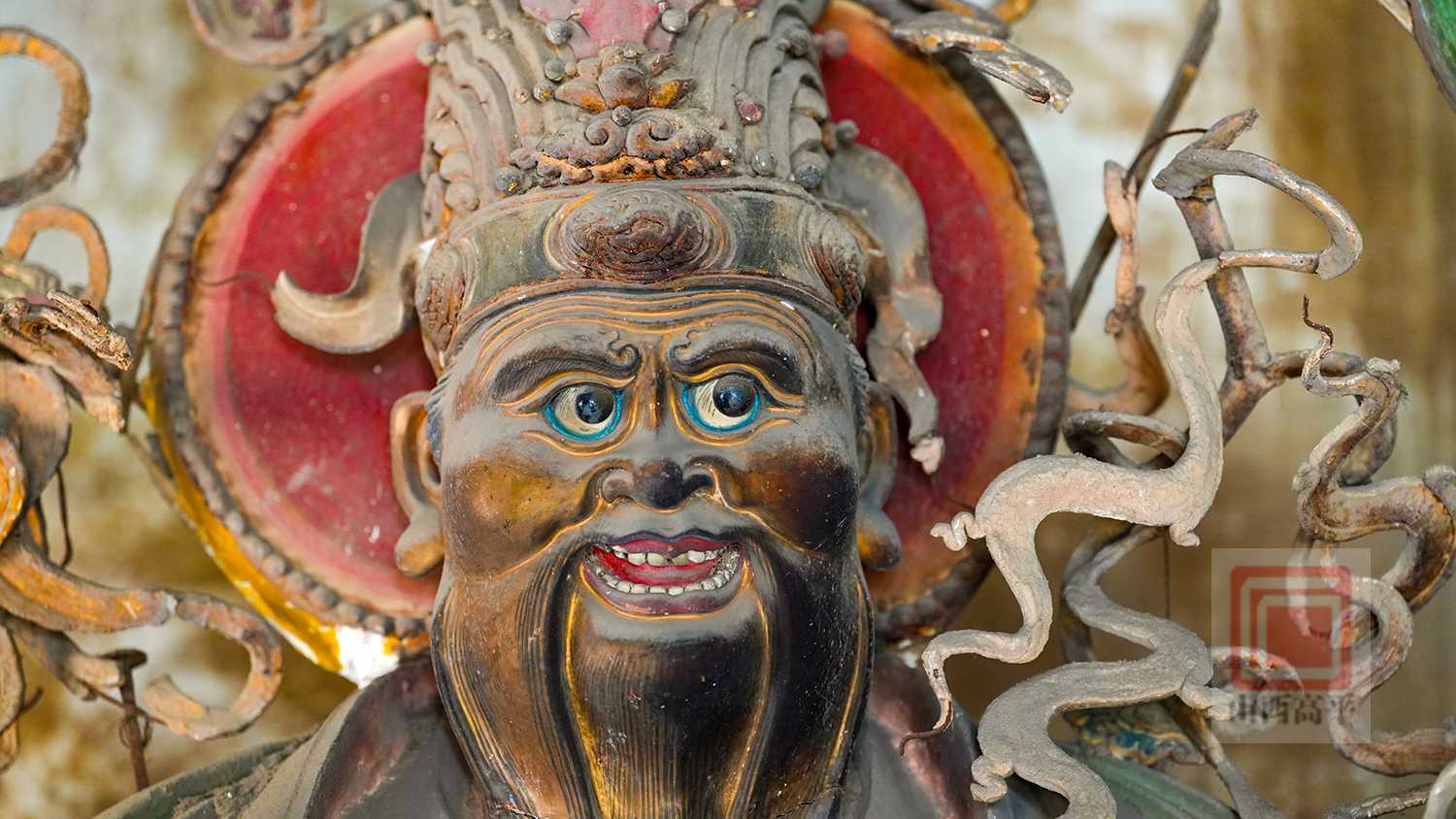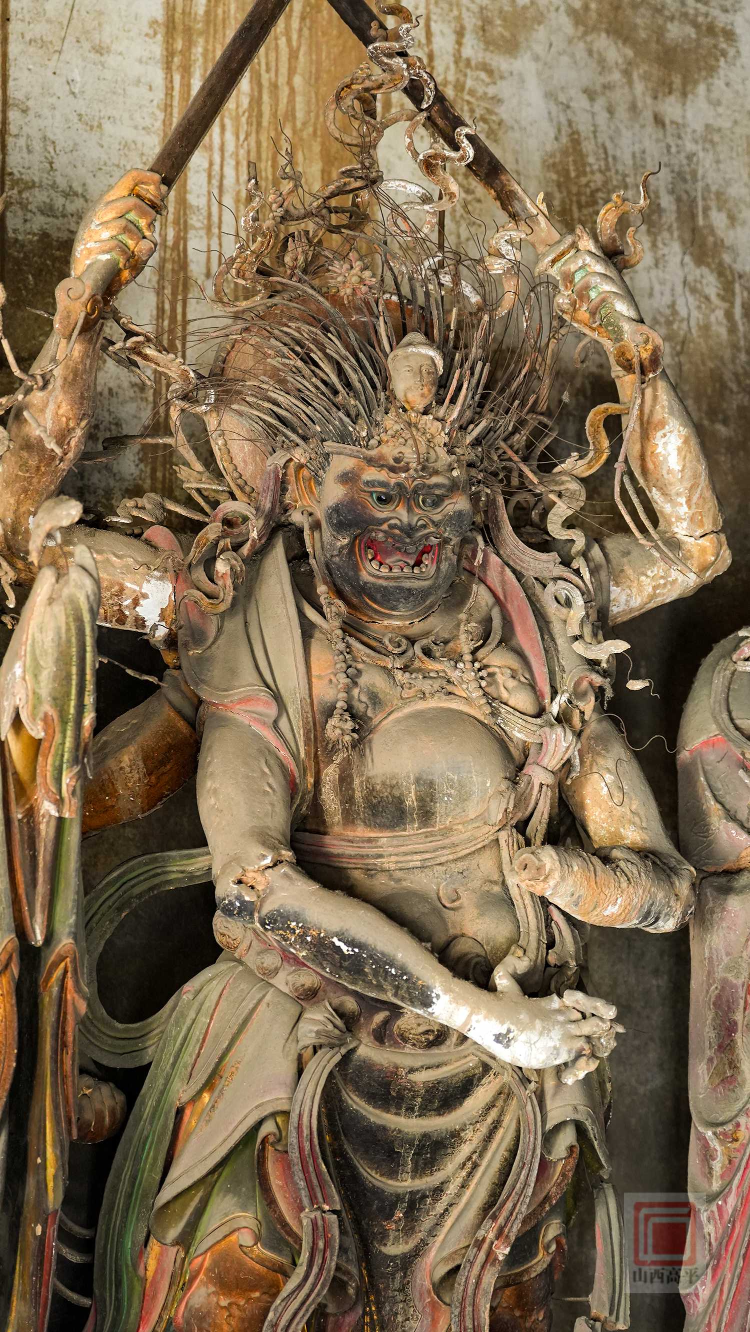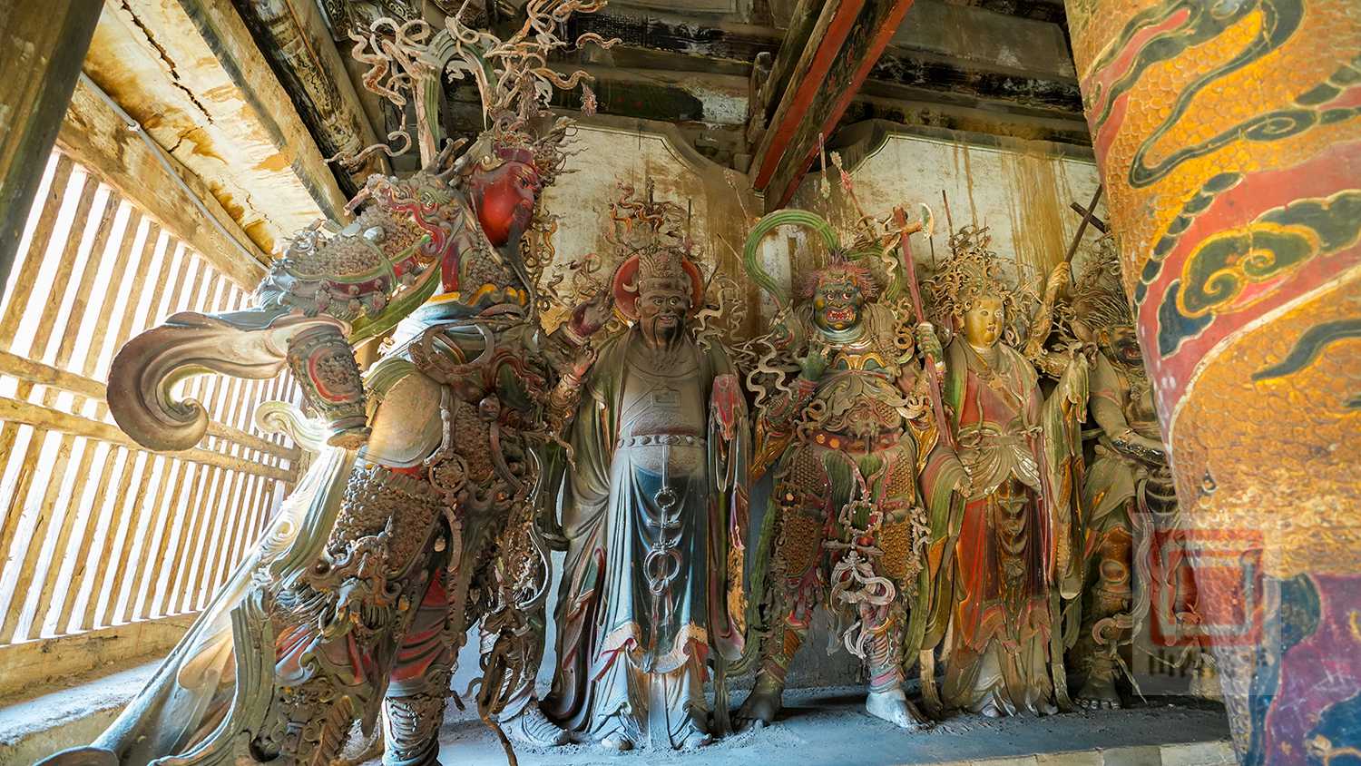 冬至前后,正午太阳高度角达到一年中的最小值,阳光以极低的角度越过屋檐,照进殿内。随着光线移动,一尊尊彩塑的面部表情、发冠装束、服饰纹理被一一照亮,熠熠生辉。一堂彩塑,满堂喝彩。在光线的映射下,崇宁真君身上的铠甲泛起金色光泽,昭惠真君一身正气,阎摩罗王、散脂大将、娑竭罗龙王、深沙大将的面部轮廓、动作神态清晰可见,尽显神像威严,带给了游客极强的艺术感染力和视觉冲击力。