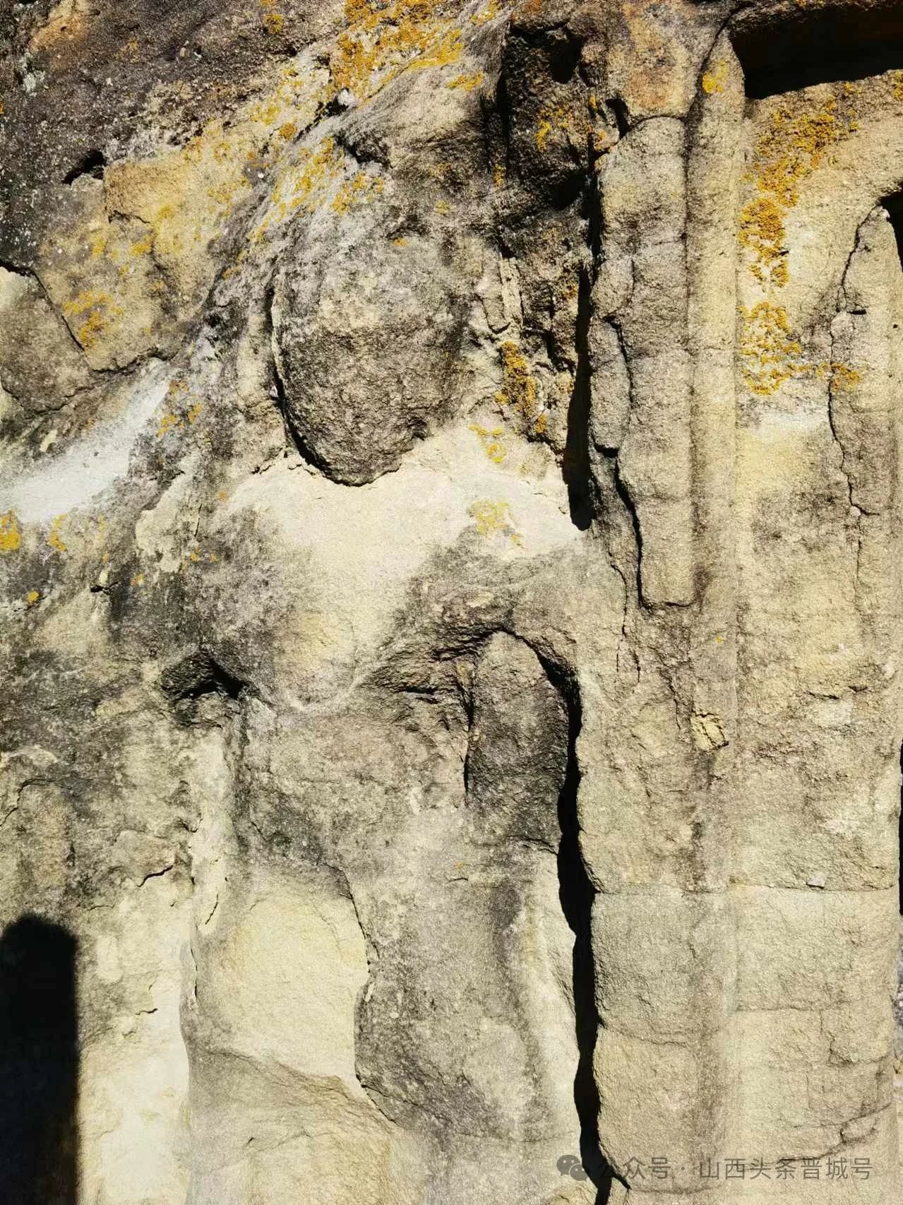 窟门左右两侧各立一面目不清的力士外,由于头部缺失,双臂及手风化严重,手势、姿态不可辨,崖面布满黄色斑块,病害严重。
